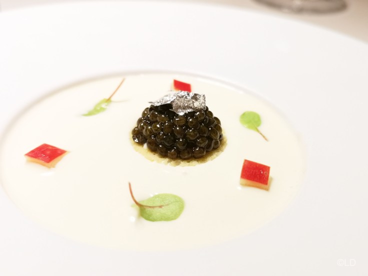 Amuse bouche: châtaigne, fève de tonka et mousse de Panais; Homard en émietté, gelée de crustacés, crème de céleri et Caviar. Techniques and perfect elaboration of these dishes