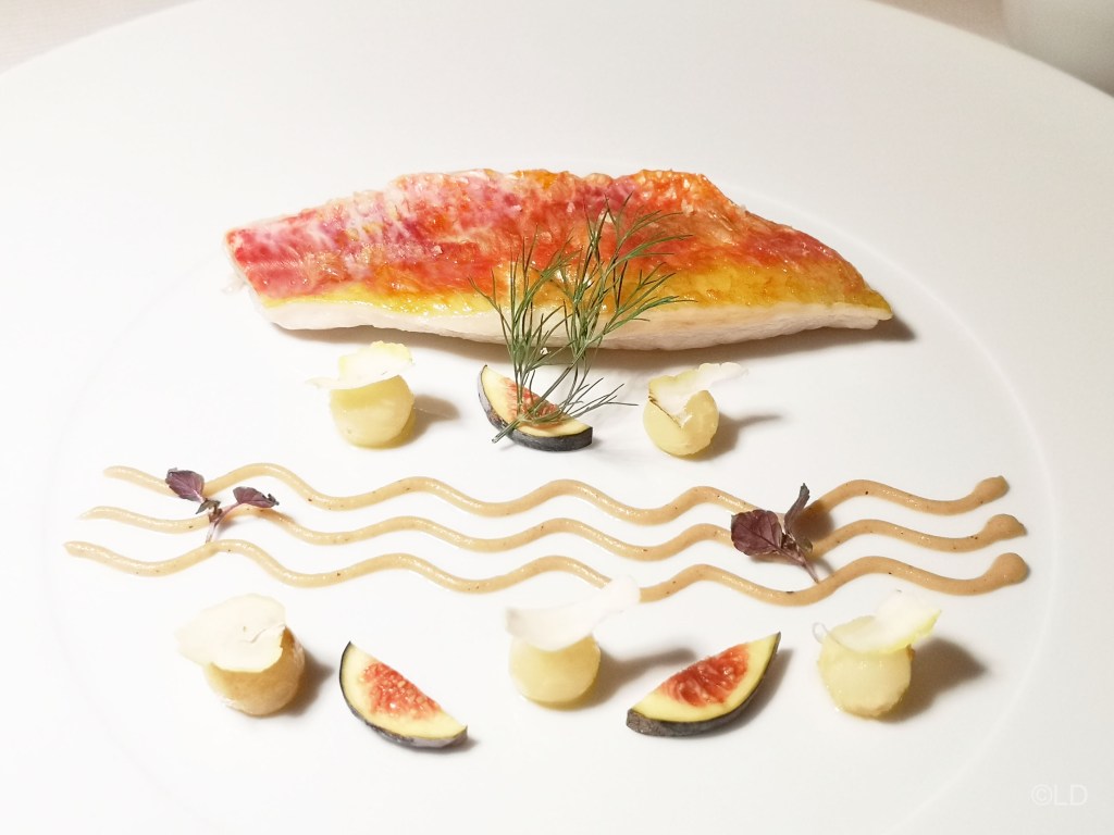 Rouget juste raidi, crème de châtaigne, céleri et figue, fumet de poisson au vinaigre Xérès. Nice dressing, fair cooking and good balance of ingredients
