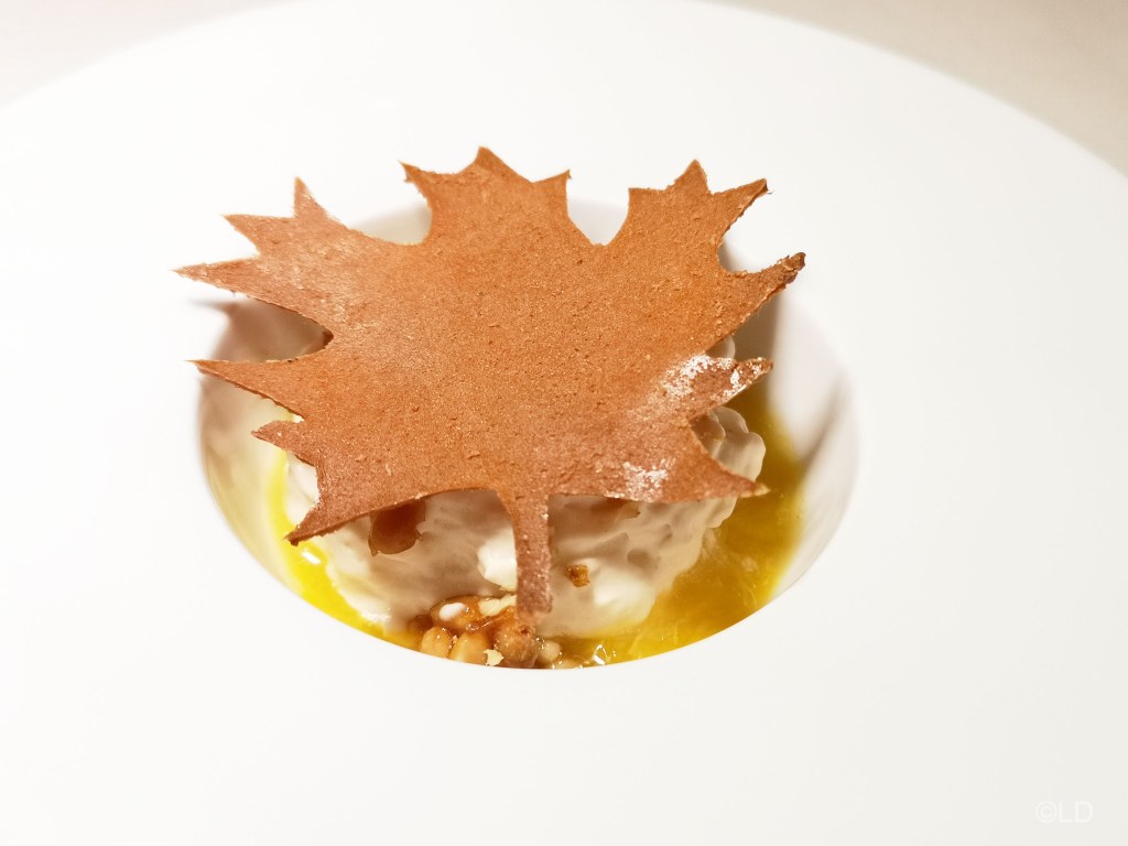 Pré-dessert: marmelade de mandarine et citronnelle, sorbet mandarine, mousse de châtaigne; Citron: tuile noisette garnie de mousse chocolat blanc, meringue et confit citron – estragon, émietté de sablé à la noisette. Magnificent marmalade and mandarin sorbet, extraordinary sweetness and freshness, well done !