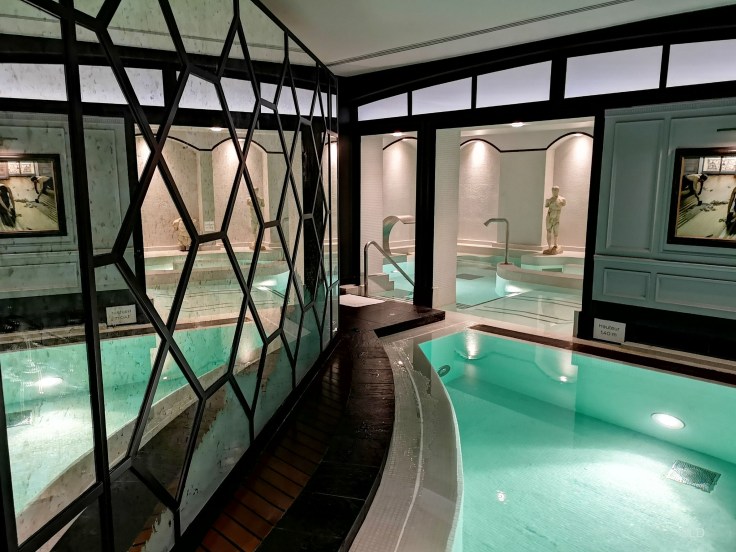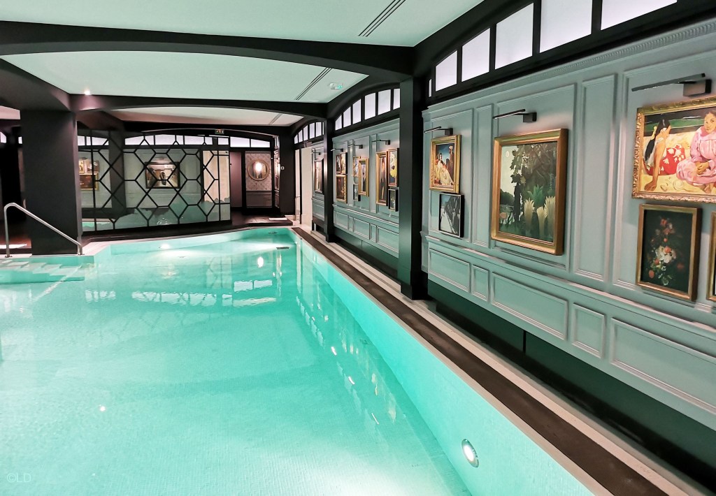 Majestueuse piscine ‘arty’ du Spa Diane Barrière qui vous plonge dans un univers hors du temps, avec ses tableaux au mur, sous les Champs-Élysées ! aux lumières tamisées et mosaïques subtiles, d’où se dégage une ambiance apaisante au cœur de Paris. Glissez dans ce lagon chauffé à 31°C