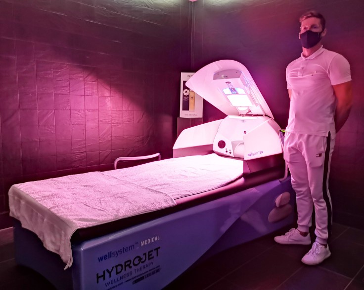 Le parcours aquatique fait de jets, de bulles et de son couloir à contre-courant; salle de soin, le lit massant Hydrojet est doté d’une technologie exclusive, mise au point par un ostéopathe allemand. De l’eau contenue dans le lit est projetée sous le lit massant en formant un mouvement elliptique. Cette eau chauffée vient se répercutée contre le matelas et ainsi masser la personne installée dessus. L’utilisateur ressent alors les effets de ces jets d’eau chaud et peut se laisser aller pour un sentiment de relaxation absolu.