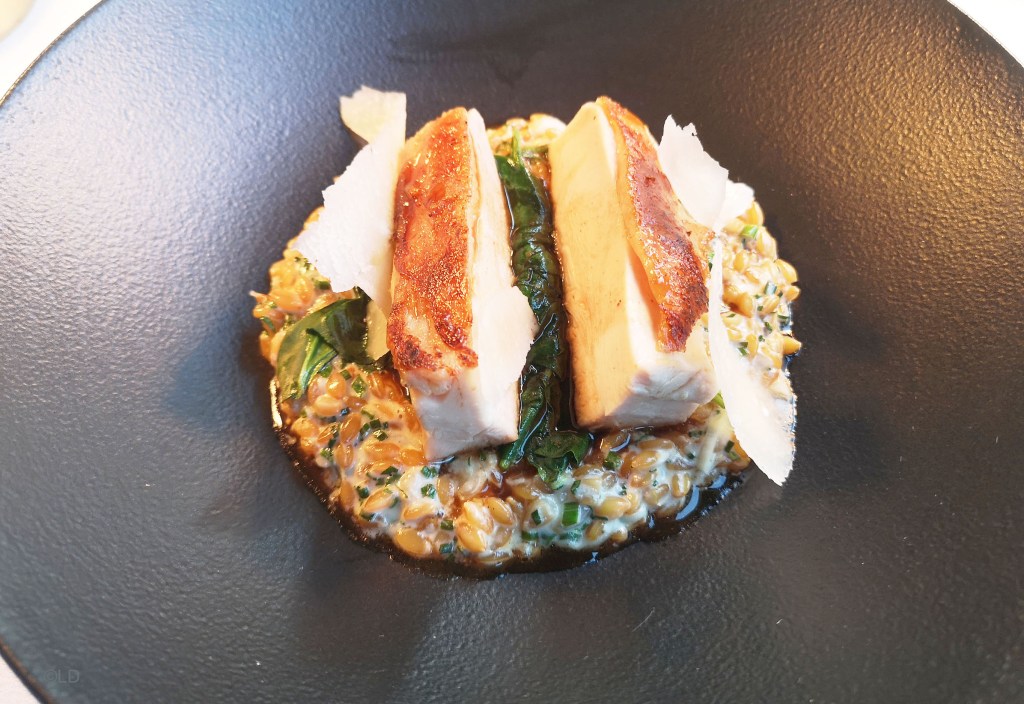 filet de Dorade à la plancha, vierge aux agrumes, écrasé de pomme de terre; Suprême de volaille fermière, petit épeautre au parmesan, pâte de citron aux olives vertes, magnifique produit, cuisson juste, un régal !