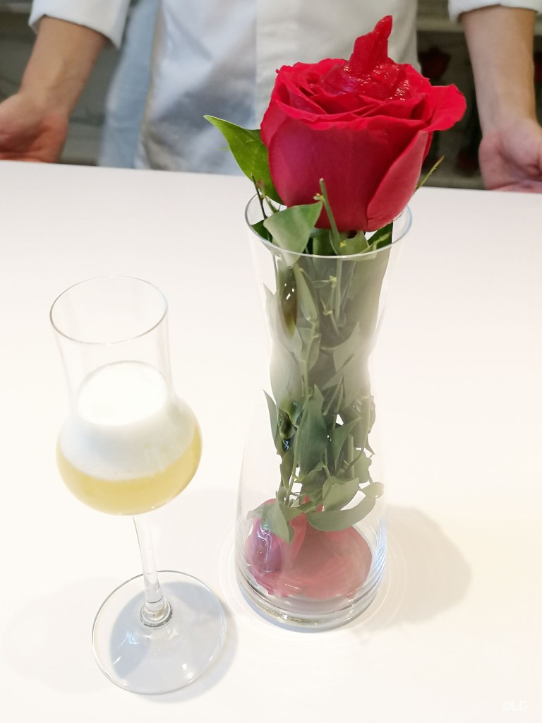 The rose ‘welcome’ drink; Shiso saam, red tuna and starry moss served with Penedes Mas Escorpi Chardonnay 2019; Hard-boiled egg served with ‘La Riva’ Sanlucar Manzanilla Fina Miraflores Baja