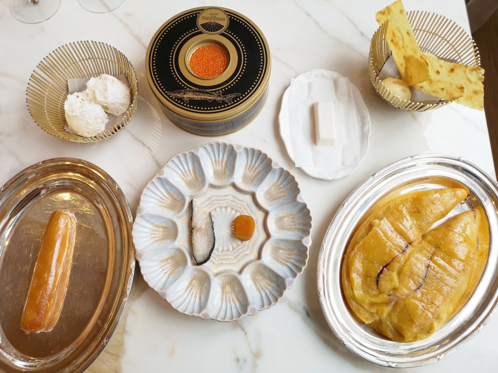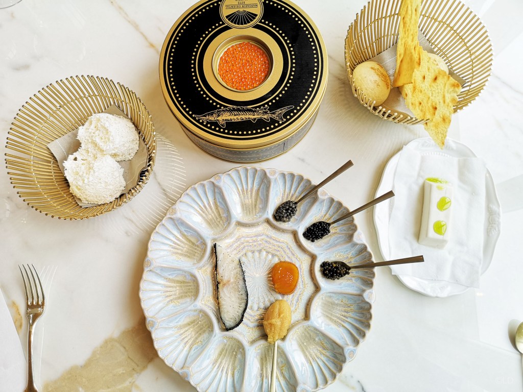 Caviar and fish roe selection served with Champagne Cazals Claude Carte Or Grand Cru Le Mesnil sur Oger