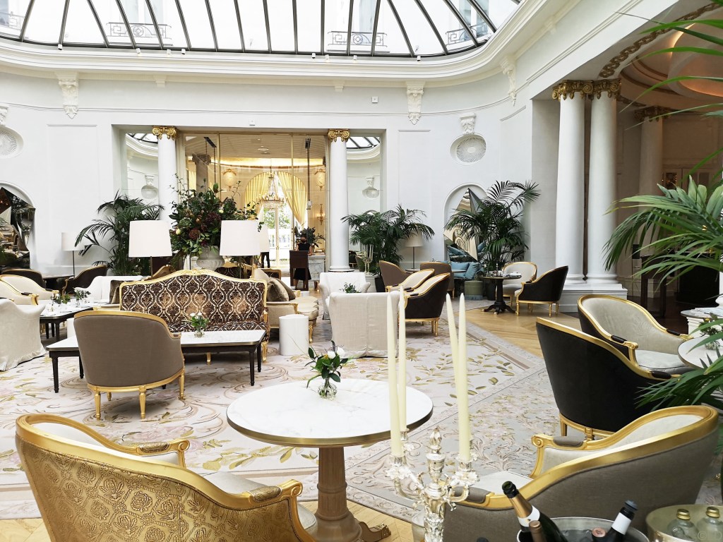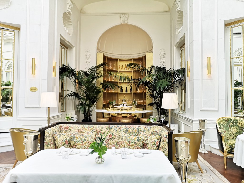Beautiful hand painted crockery from Limoges. The Champagne Bar is majestic ! Cozy atmosphere, with its green plants, lampshades, and stylish armchairs …