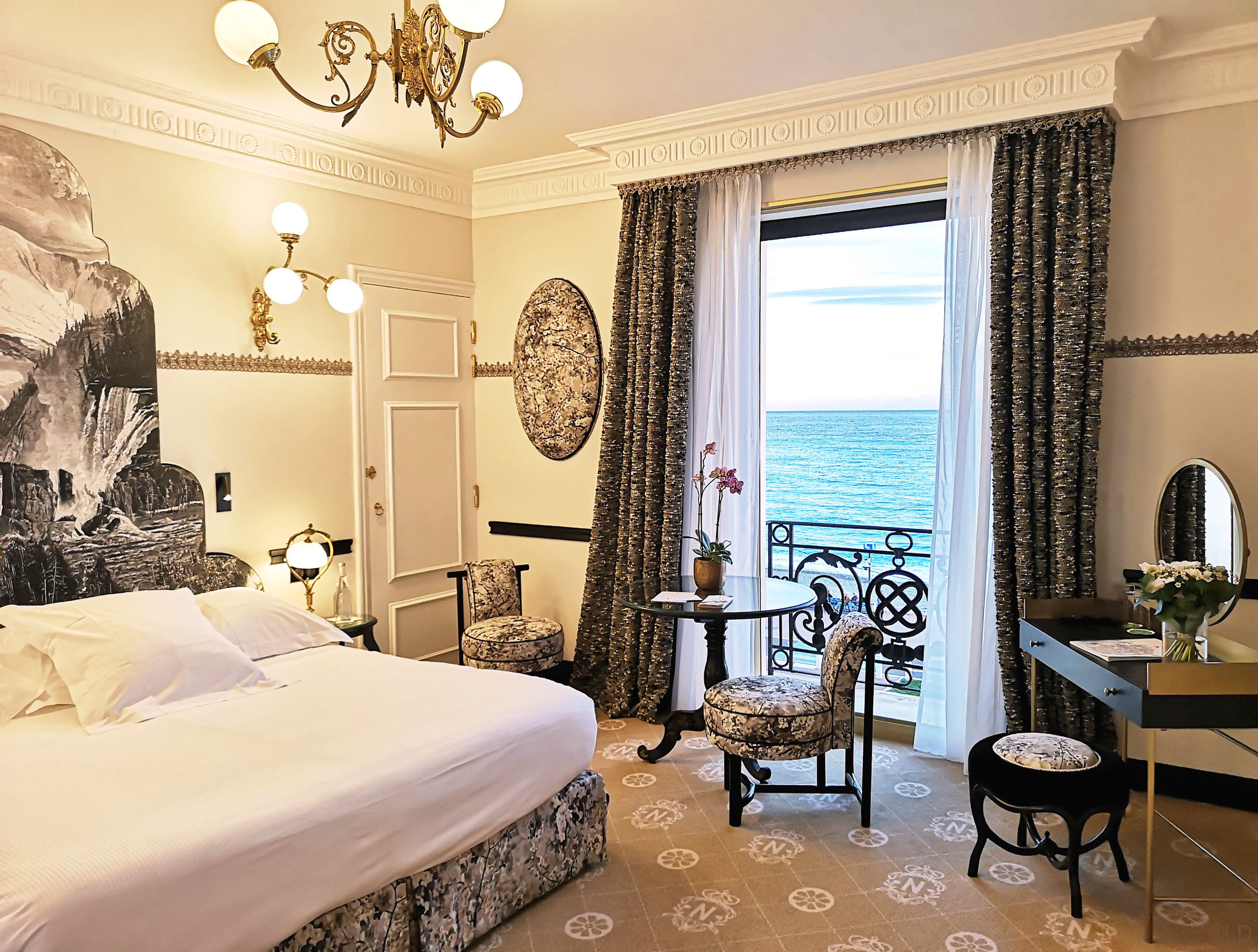petite chambre De Luxe vue mer, décoration Pierre Frey, les couleurs délicates des tentures de soie et de velours en font une véritable ‘bonbonnière’. Richement décorée, elle est la quintessence du ‘goût à la française’. Les chambres De Luxe vue mer du Negresco séduisent et impressionnent par la vue hypnotique qu’elles offrent sur l’immensité de la mer Méditerranée.
