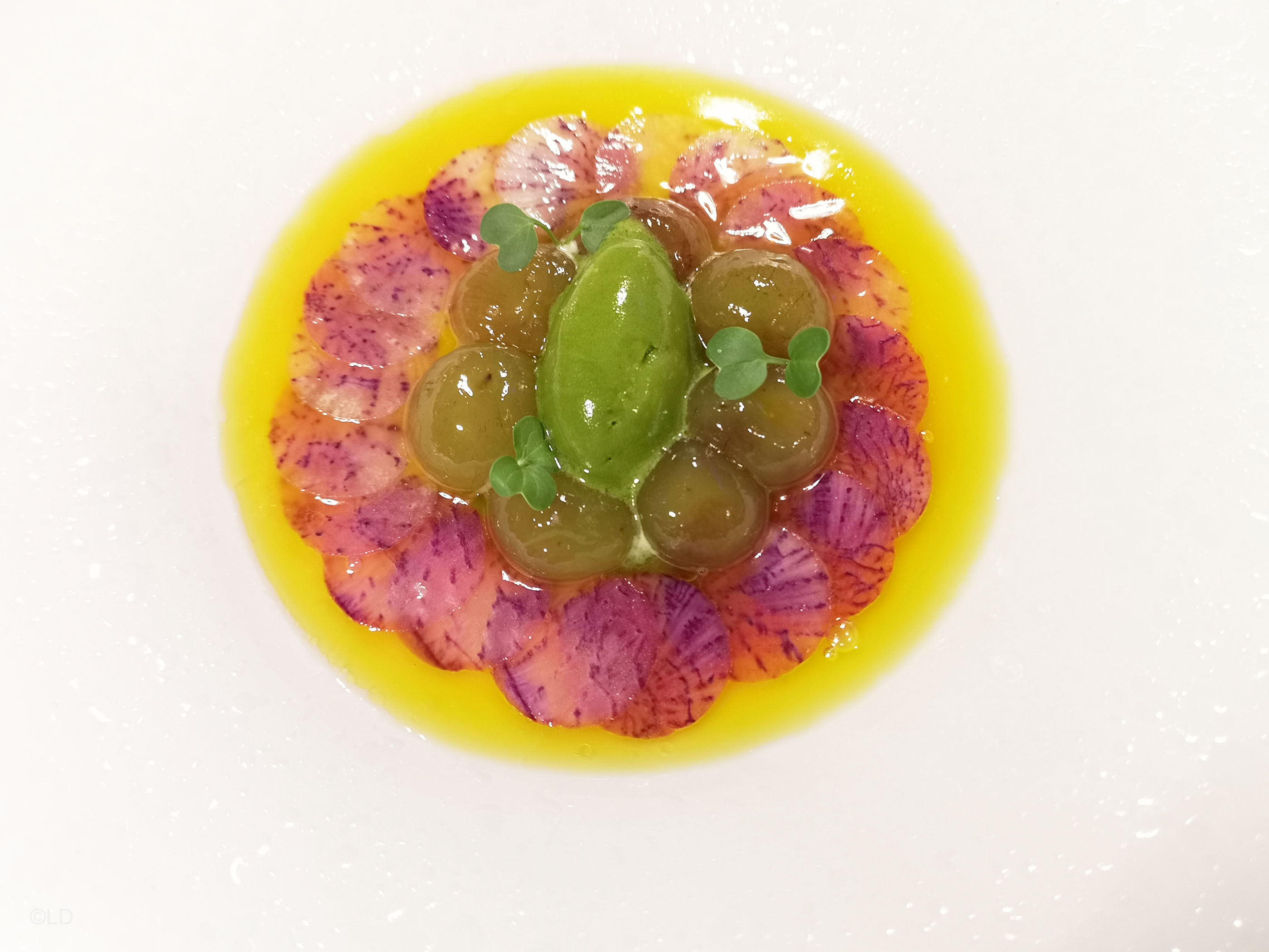 L’instant végétal aux radis , raisin de Muscat, sorbet aux herbes, magnifique plat, du goût, la fraîcheur et douceur du raisin, une belle assiette. Le Céleri rave d’Agnès, laqué au miel de bruyères, café d’Éthiopie, ici, ‘il se passe quelque chose’, il y’a ‘tout un monde là dedans !’ présentation contemporaine et efficace, dans des tons automnales, jolie proposition moderne qui ravi le palais et les sens !