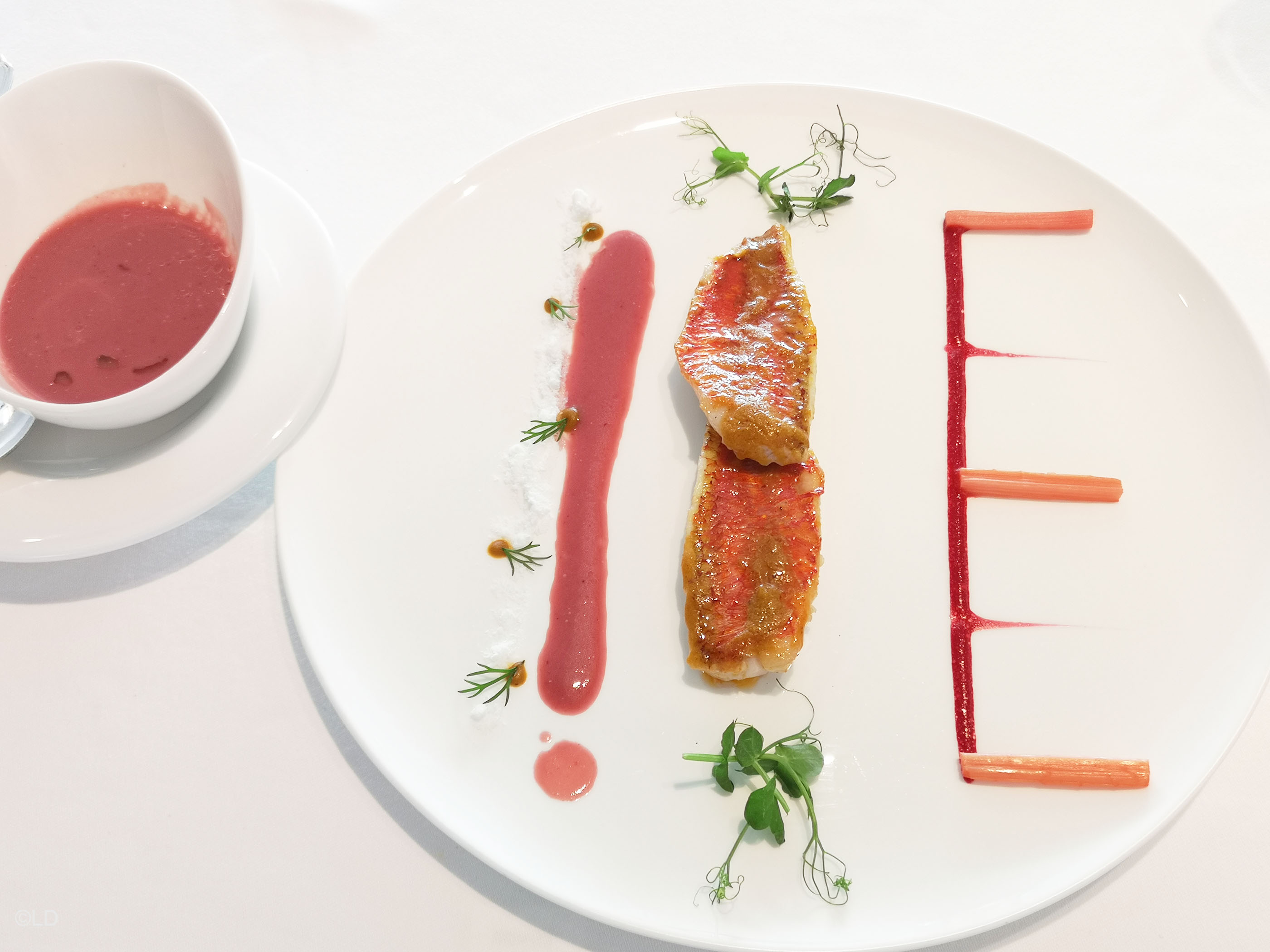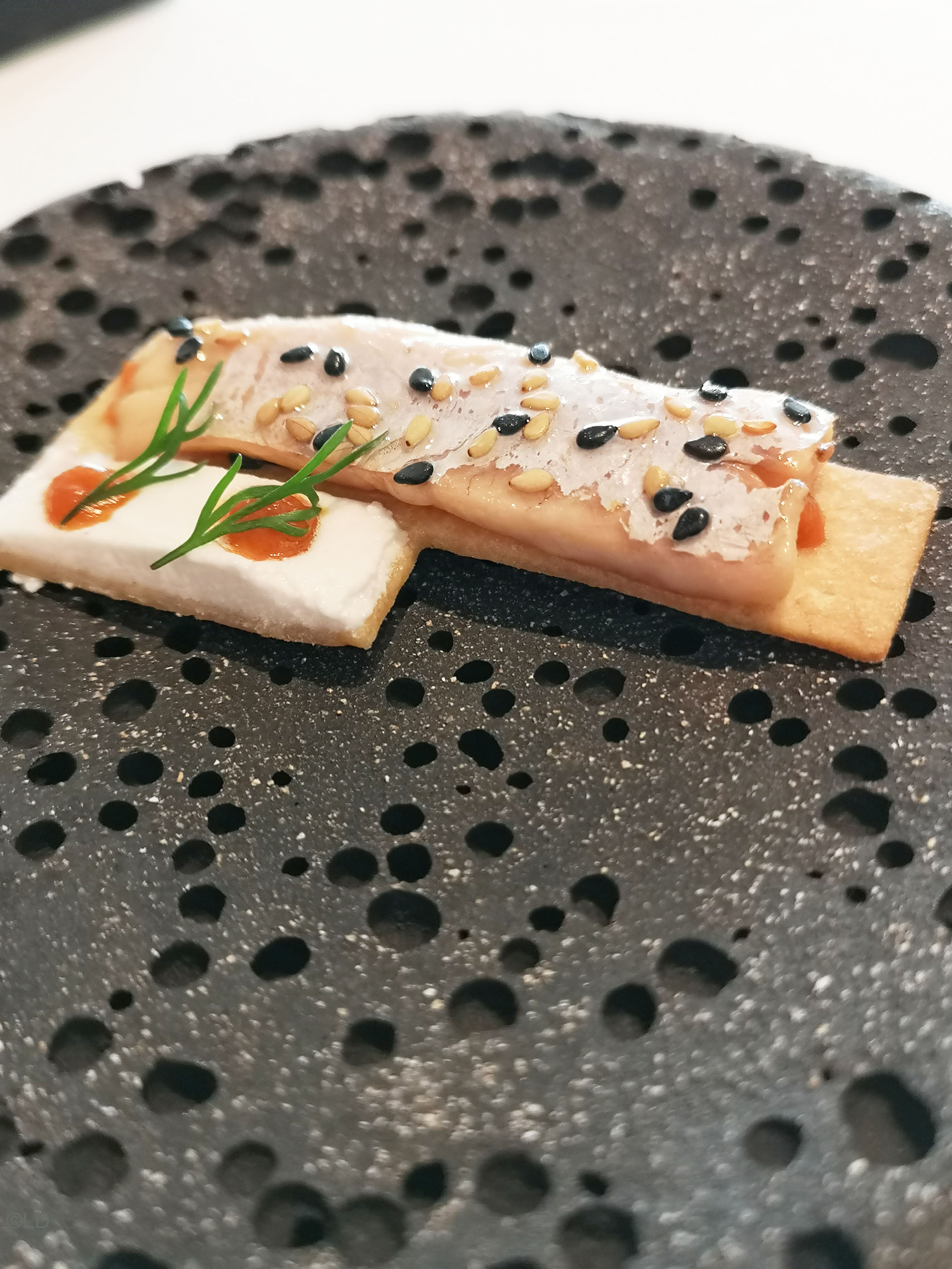 Huîtres tièdes à la Kontxa, avec cacahuète et sésame noir, mojo de tomate (…’hommage à ma ville, San Sebastian et ses gardes corps le long de la plage’… E.Arzak) servi avec un vin blanc Chivite Las Fincas 2 garnachas collaboration Arzak.; Fondements du rouget, Rouget confit aux épices, poudre de coco et mousse étoilée d’algues rouges, bâton de rhubarbe, mojo de curry et framboise, servi avec un blanc Enate Chardonnay 2020.; Cube de pomme de terre troué avec truffe fraîche et jaune d’oeuf, servi avec un vin blanc Allende Rioja 2017.