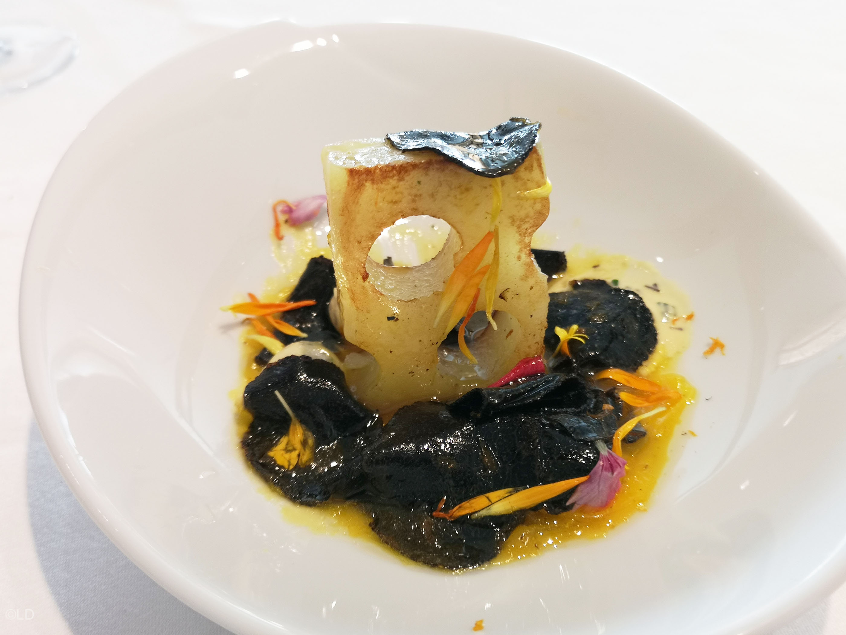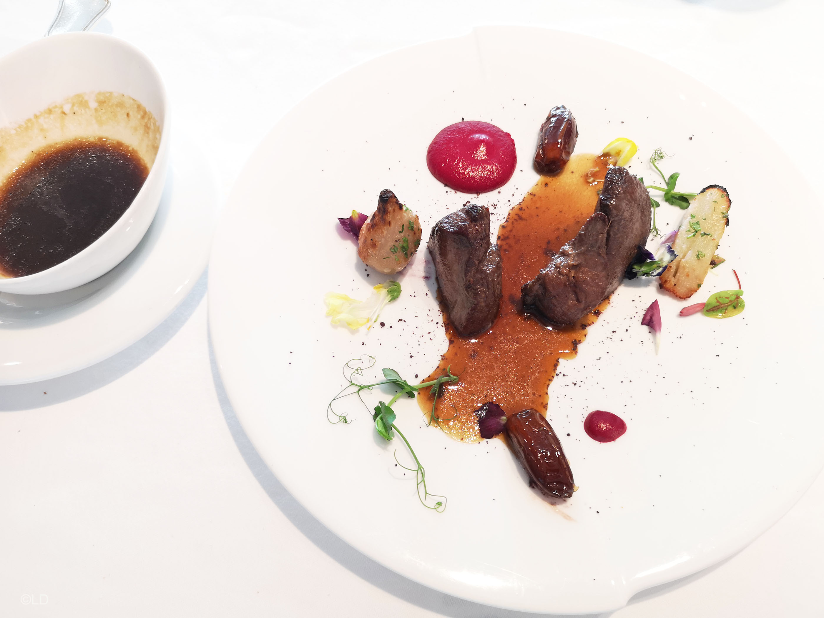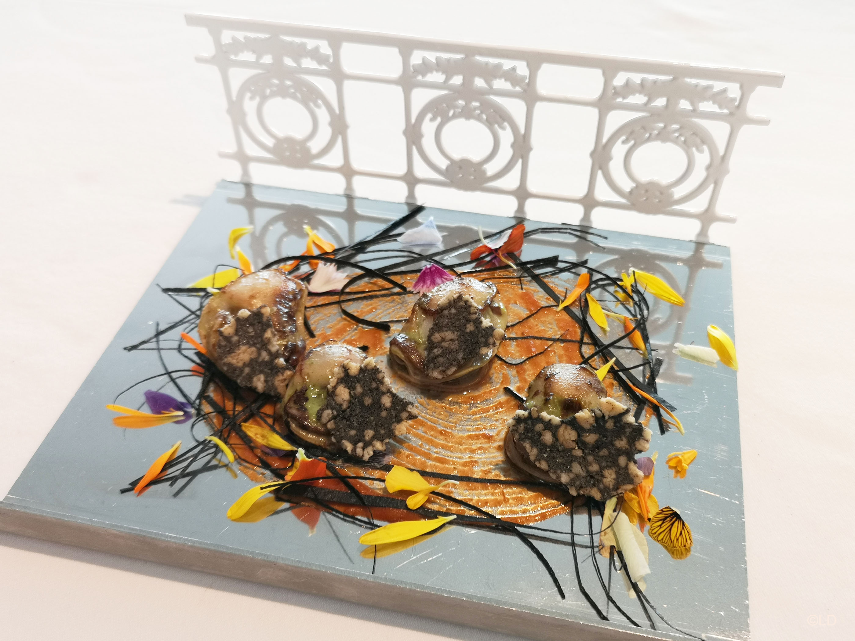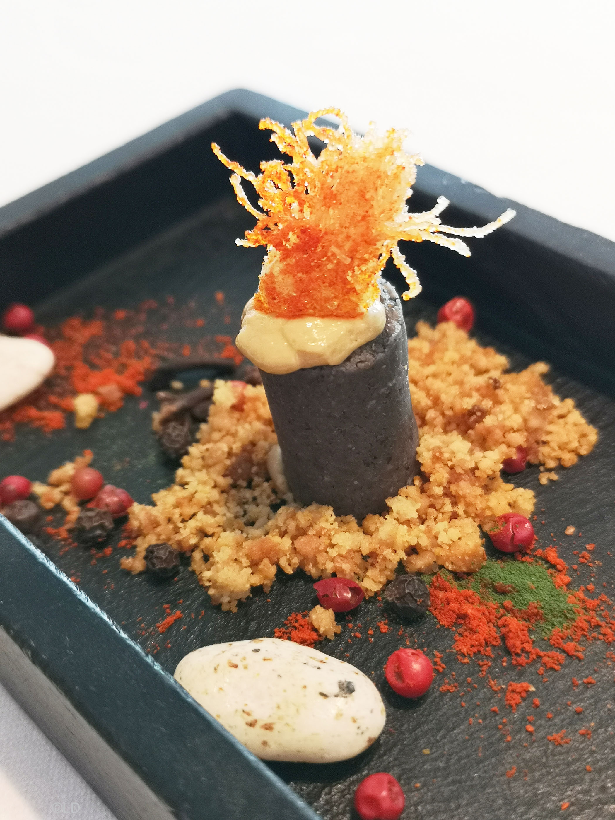 Canard rôti parfumé au thym dans sa boîte et dates, légumes oubliés, oignons, servi avec un vin rouge Pintia 2012 Valladolid.; Énigme, crème mielleuse de cerise et yuzu, amandes, croustillant à la menthe (jeu de lettres, retrouvé le mot !) servi avec un vin blanc doux de Malaga (MR) Mountain wine 2017.; Ruines de chocolat, pectine de caroube et croustillant au miel, colonnes de texture de chocolat Vietnamien, crémeux au caroube et croustillant de miel et fleurs d’oignon (…’vision de la pandémie et des catastrophes passées’… E.Arzak) servi avec un Torello Dolç Vittios Merlot Penedès.