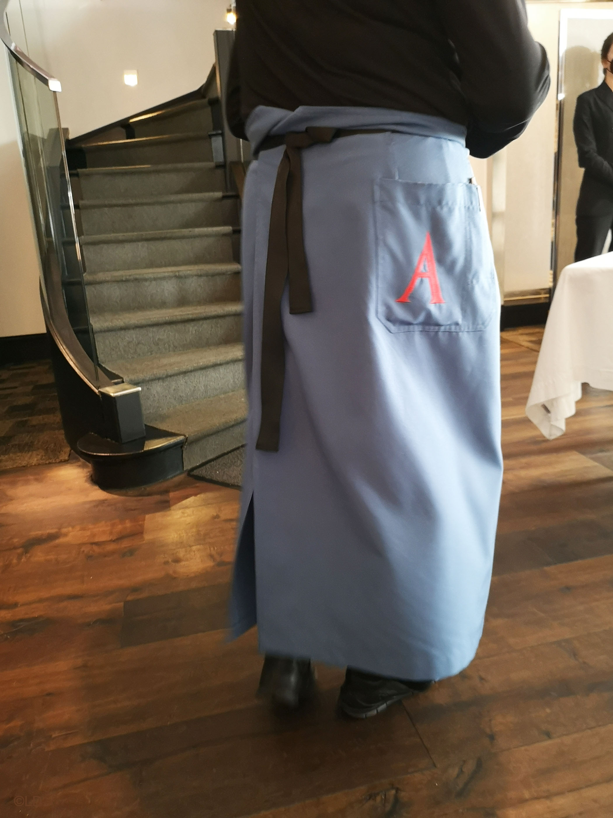 Épi de maïs bleu, avec foie gras, baies, crumble, épices et bonbons anisés; Sardine avec absinthe et fromage frais sur toast; tenue des femmes en salle (tablier bleu au logo A)