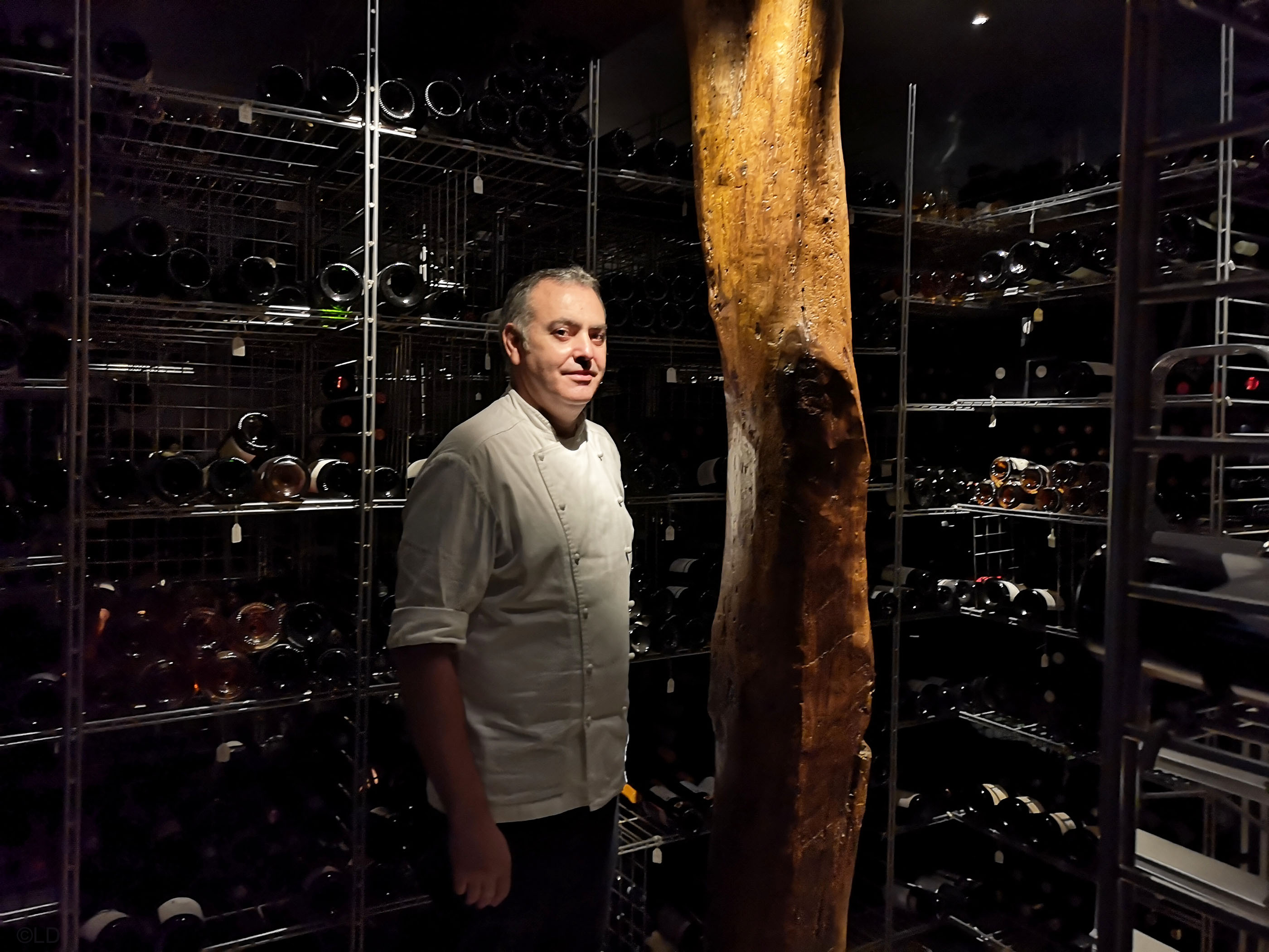 Dans le salon d’accueil, ce tableau, hommage au faisan; la cave située à l’étage et cet imposant tronc d’arbre; le ‘Labo’ et ces centaines de petites boites à épices et poudres du monde entier.