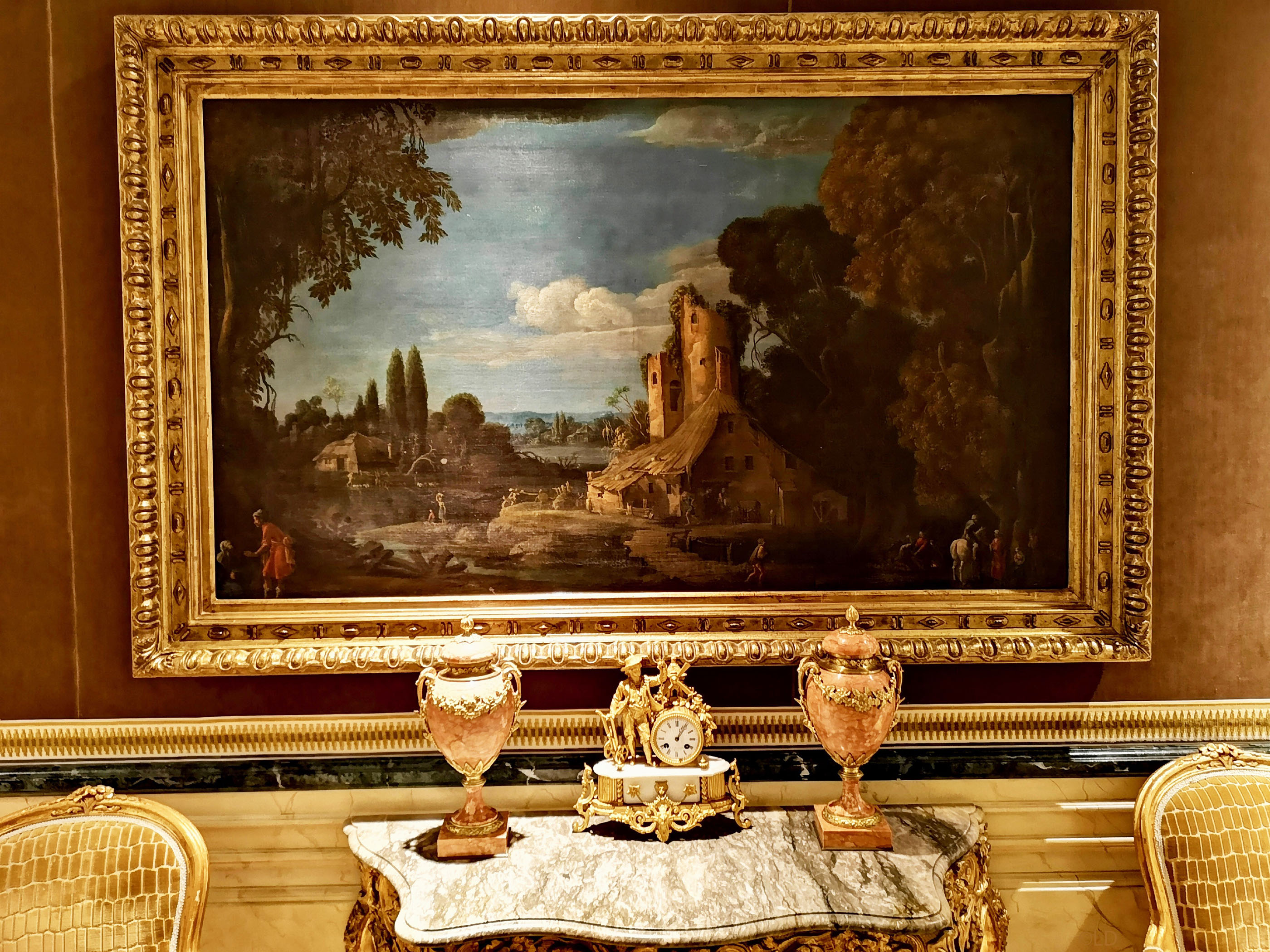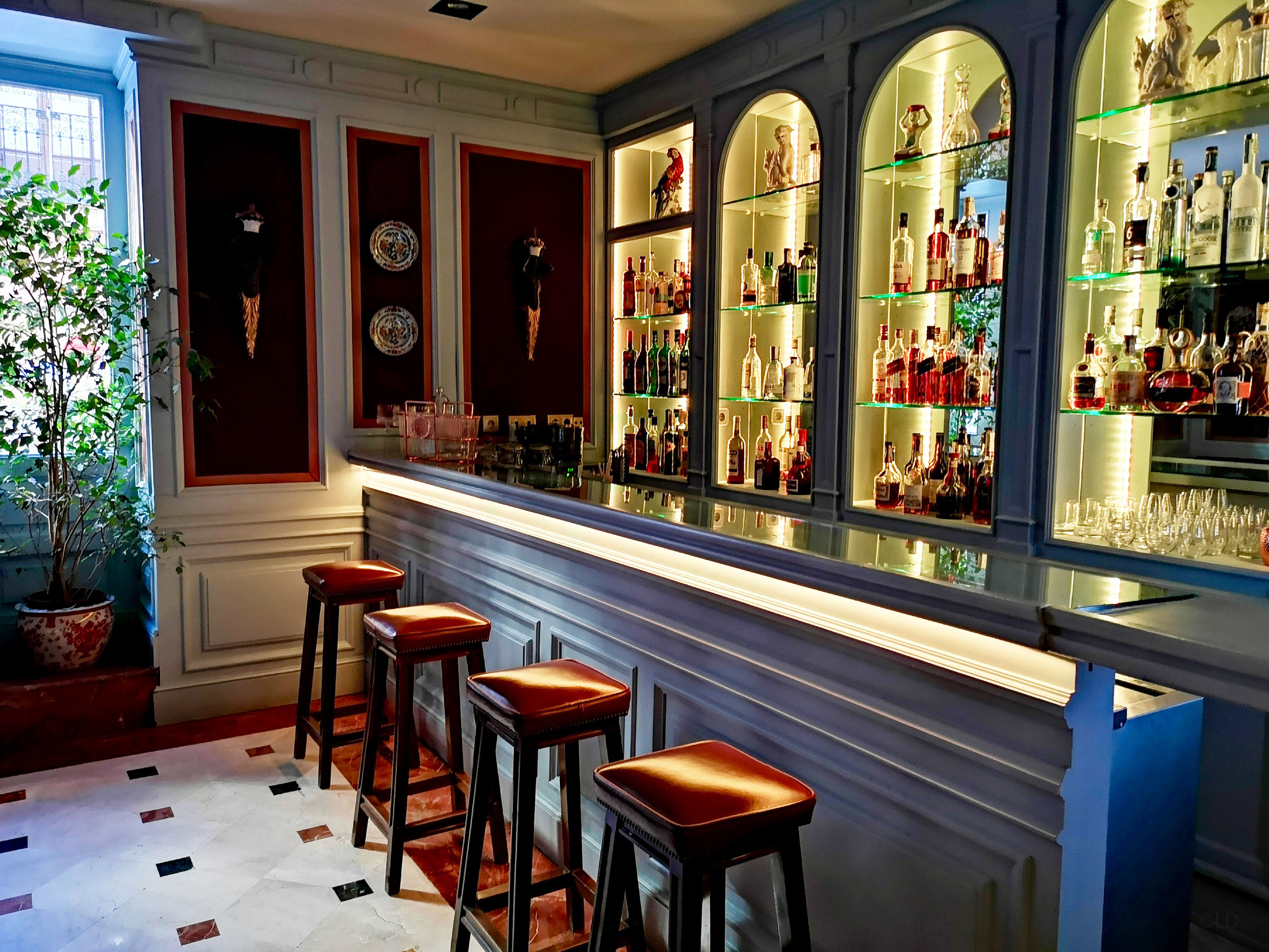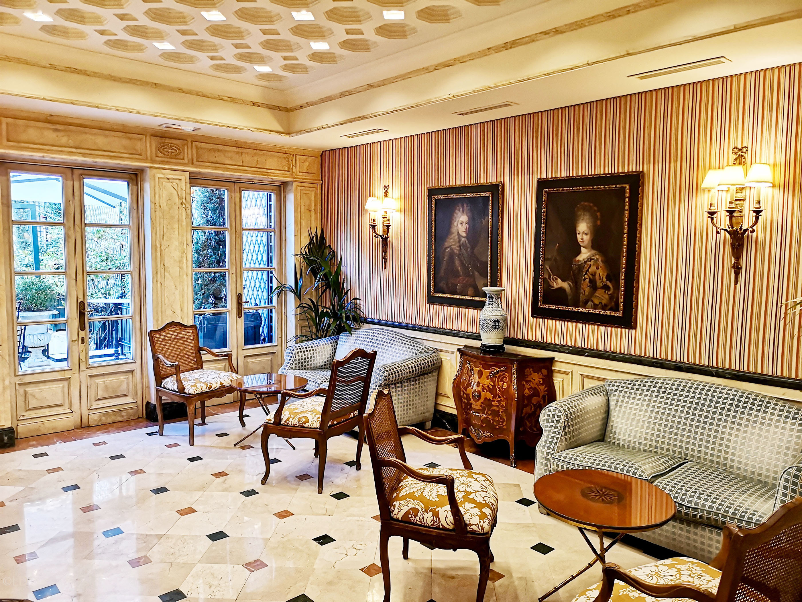 Une autre toile remarquable et la première à accueillir les visiteurs dans le lobby est une scène de pays primitif hollandais, datée de 1671. D’autres éléments tels que les stalles ou le tresillo antique proviennent du Palacio ducal de Medina Sidonia, restauré et re tapissé avec les tissus exclusifs conçus par Lorenzo Castillo. Disséminées dans tout l’hôtel, vous pouvez voir des gravures signées par Reynolds. Le salon et hall d’entrée offrent un remarquable plafond en caissons qui laisse passé une lumière naturelle. Le salon de thé cosy, avec son plafond est en caissons fermés, jouis d’un accès direct sur la large terrasse. Les tableaux qui le préside sont une représentation du dernier Roi d’Autriche Carlos II »l’envoûté » ainsi que du premier roi de la Maison de Bourbon régnant en Espagne, Felipe V et sa femme Maria Luisa Gabriela de Savoie. Ces peintures appartenant à l’école Carreno de Miranda se distinguent par leur sobriété et leur absence d’artifice utilisant une technique de ‘coup de pinceau’ plus lâche et plus épais. La décoration suit la même ligne, douceur sur les murs avec des tissus rayés aux couleurs plus fraîches et plus actuelles comme les roses, les bleus et les jaunes. Dans les années 1920, l’hôtel reçu des pièces de théâtre, données en ses murs, qui firent sa renommée.