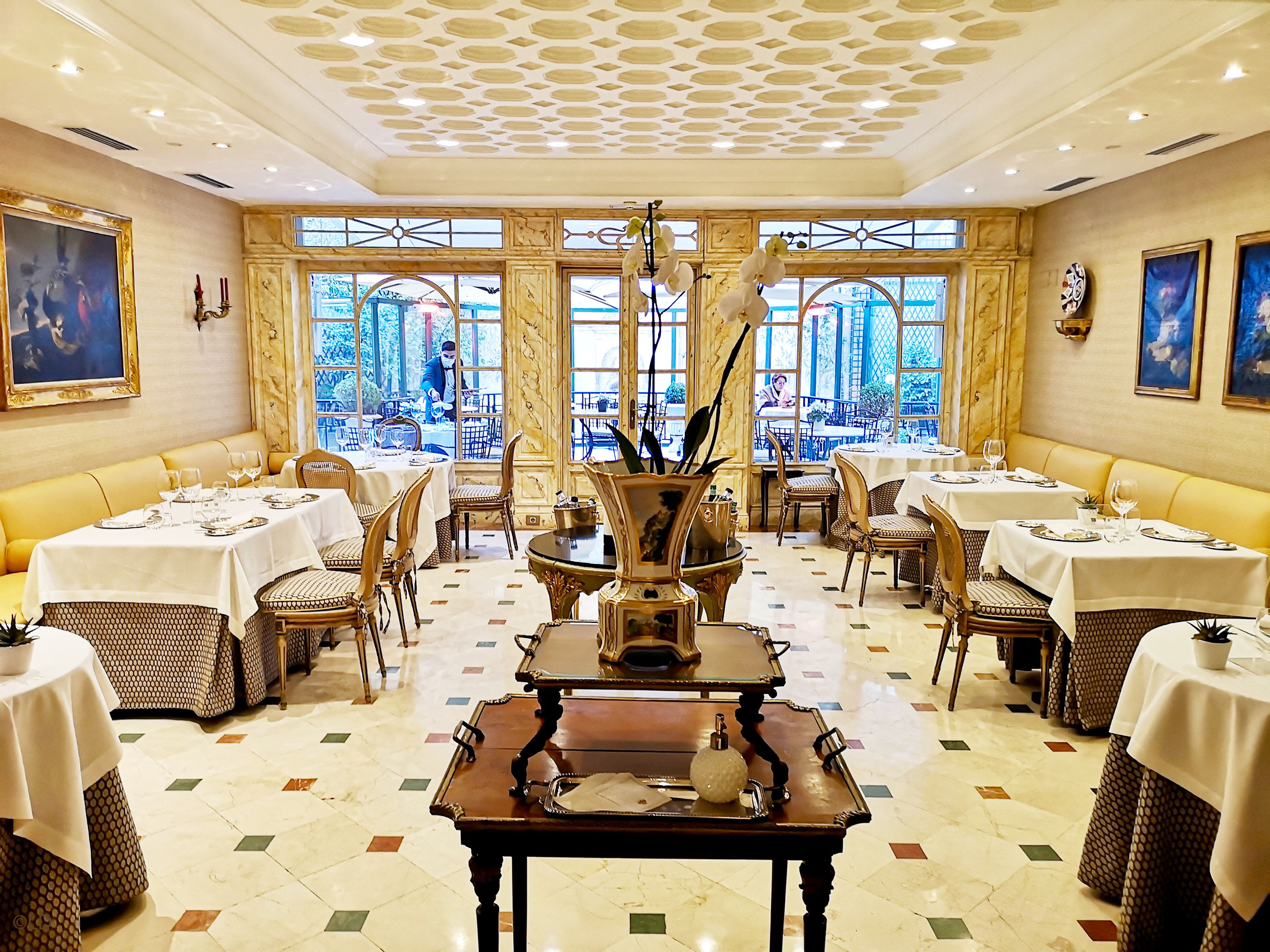 La salle du restaurant El Jardín de Orfila, avec sa banquette tout du long, dans des tons jaune clair est très agréable, l’art de la table est bien mis en valeur ! le restaurant bénéficie depuis 2018 du ‘consulting’ du Chef Mario Sandoval, deux étoiles au guide Michelin, qui lui ont valu 1 Sol Repsol pendant 2 années consécutives. Au mur, exposés, les plats spectaculaires Imaris, se distinguent par leurs motifs floraux utilisant le rouge, le bleu, le vert, le jaune et l’or comme couleurs prédominantes. Le restaurant dispose également d’une large terrasse aménagé d’arbustes et de fleurs.