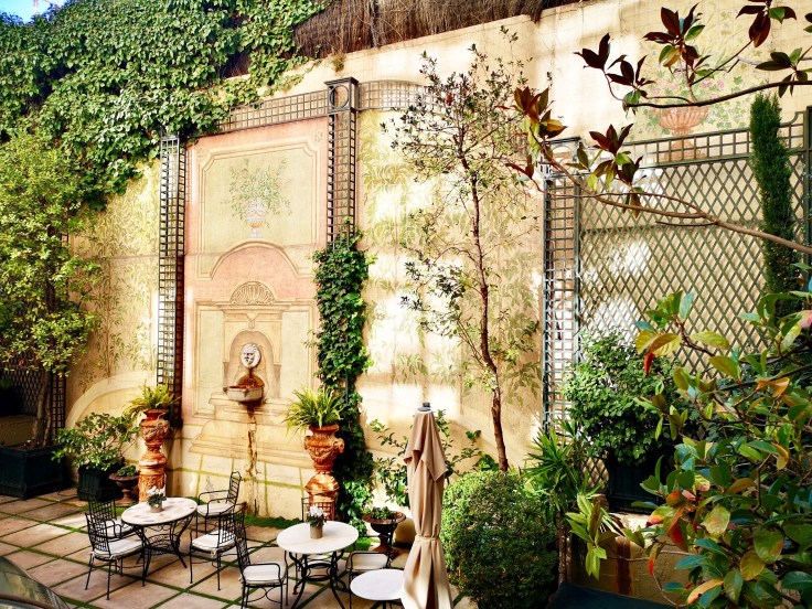La large cour-jardin fleurie et verdoyante, avec son emblématique trompe l’œil à ‘la fontaine’ pour profiter du calme au cœur de Madrid.