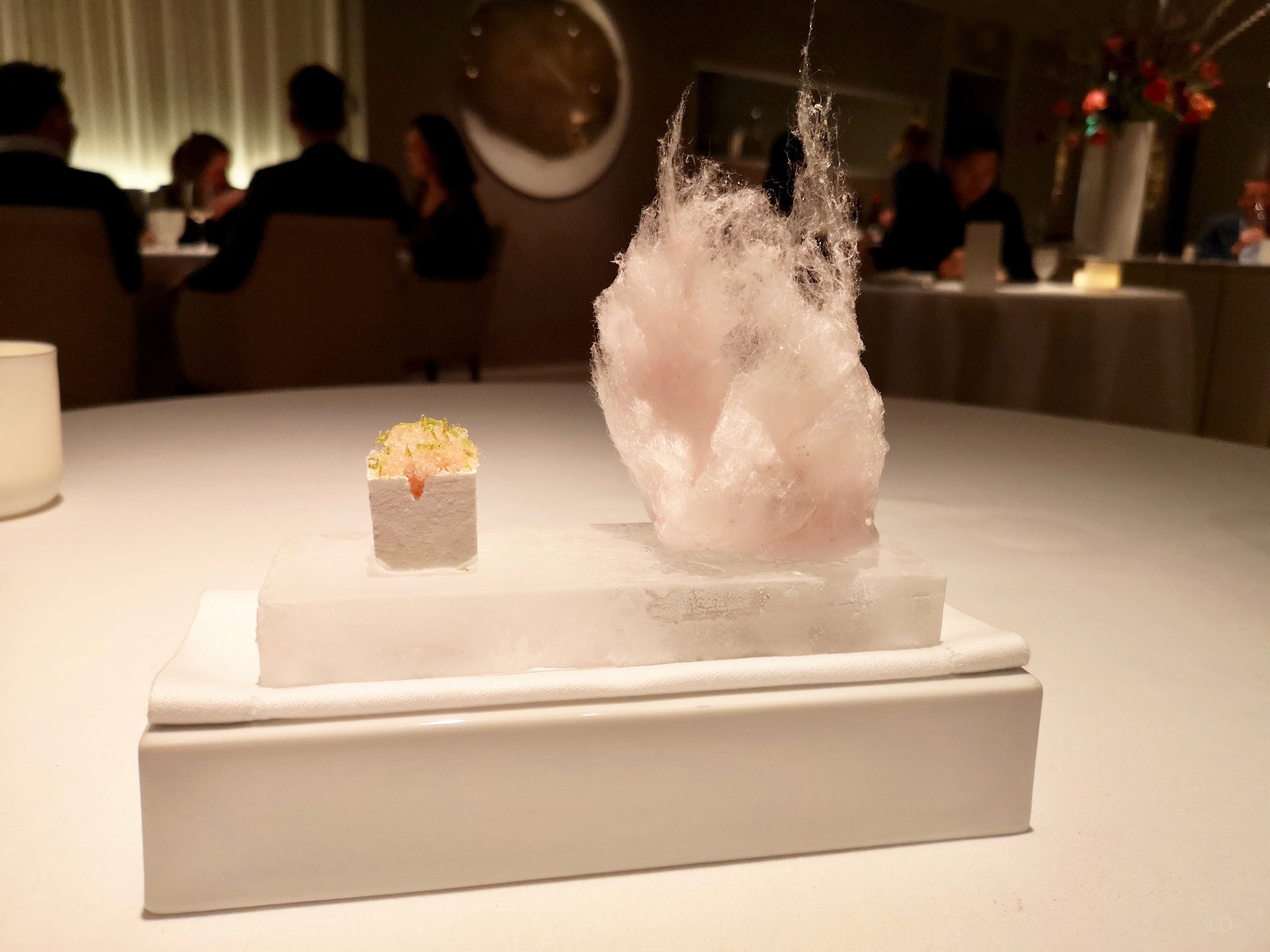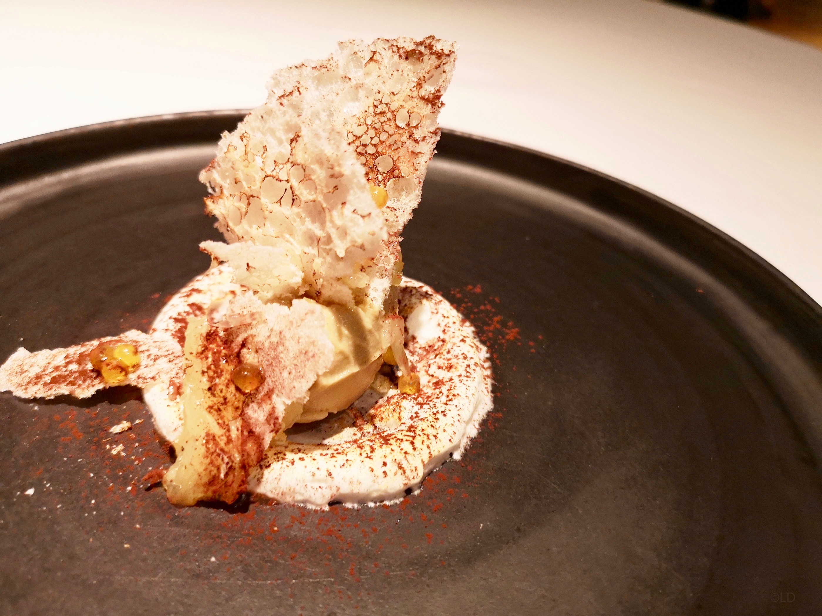 Bergamote, aubergine, cacao, laitue, crème de lait, délicieux dessert en ‘vertical’, moderne, aux textures multiples,… une réussite de la jeune pâtissière; surprise finale sur un bloc de glace, élégance et grâce, bravo ! service en salle Mr Ralph van Hotten et Mr Cas Kratz