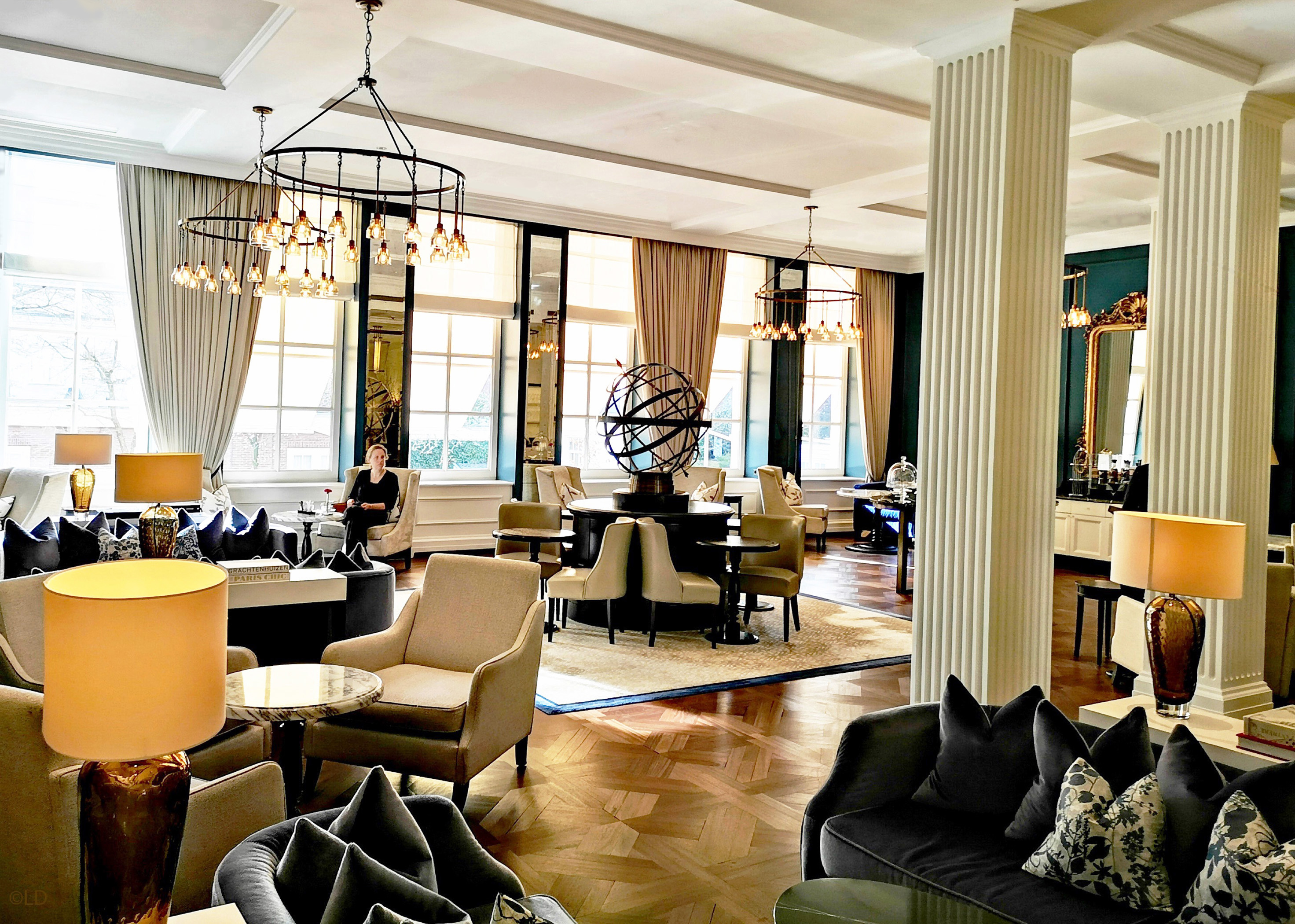 ‘Meet me at the Peacock Alley’ Retrouvons nous à l’allée des Paons, est une expression courante pour se retrouver au grand salon de l’hôtel ! pour un café, un déjeuner, une tasse de thé ou un apéritif,… Prendre le temps, y savouré le goûter par Guerlain ! Ce salon élégant avec ses grandes fenêtres donnant sur les jardins, ses luminaires en verres soufflés, ses nombreux fauteuils et canapés donne envie d’y flâner de longues heures,… À travers les colonnes finement détaillées du hall, une sphère armillaire Waldorf occupe le devant de la scène dans la salle, en référence aux liens de la propriété avec la voile, le commerce et le temps, également comme icône de l’histoire du canal et des maisons bourgeoises d’Amsterdam.