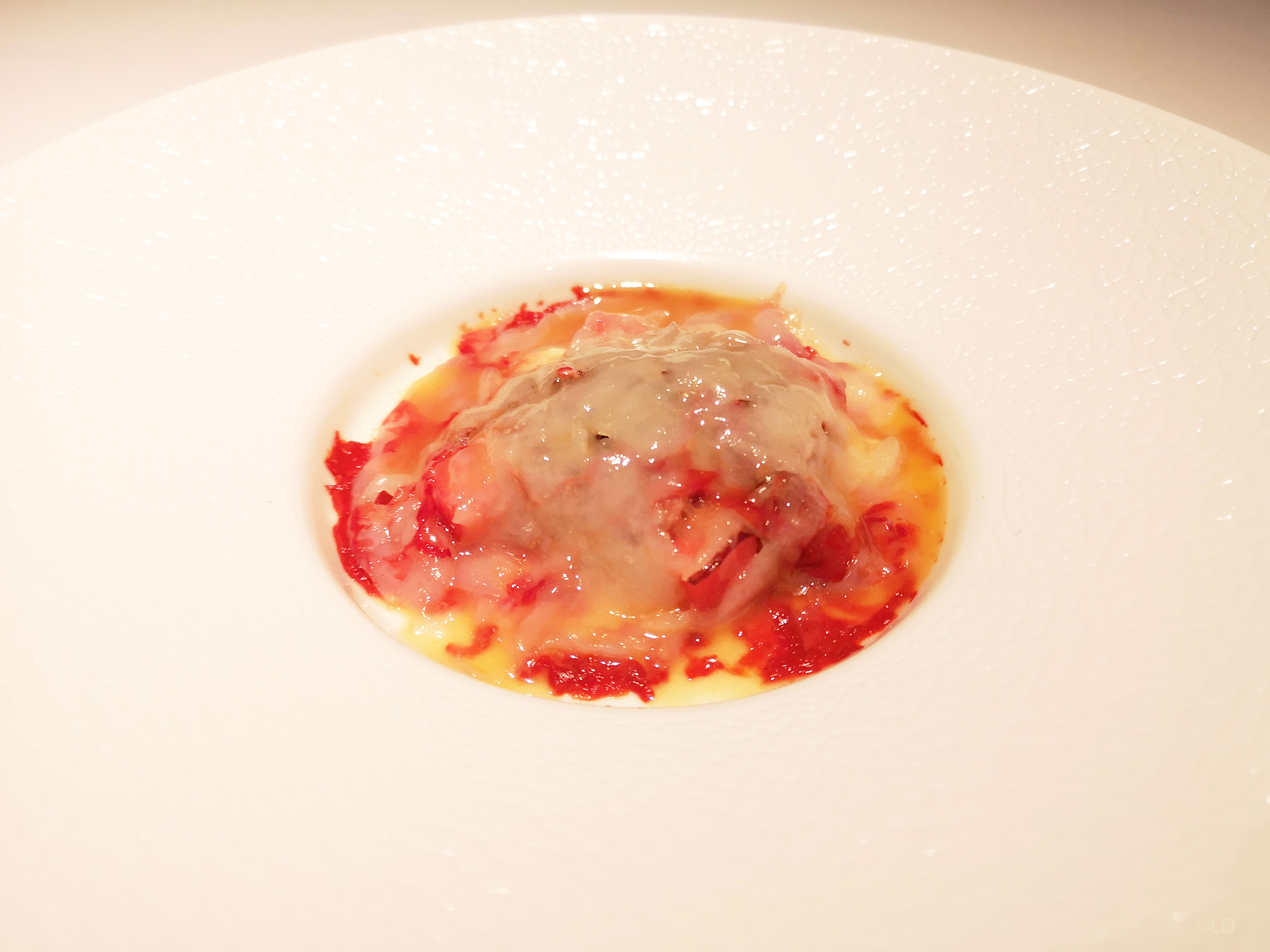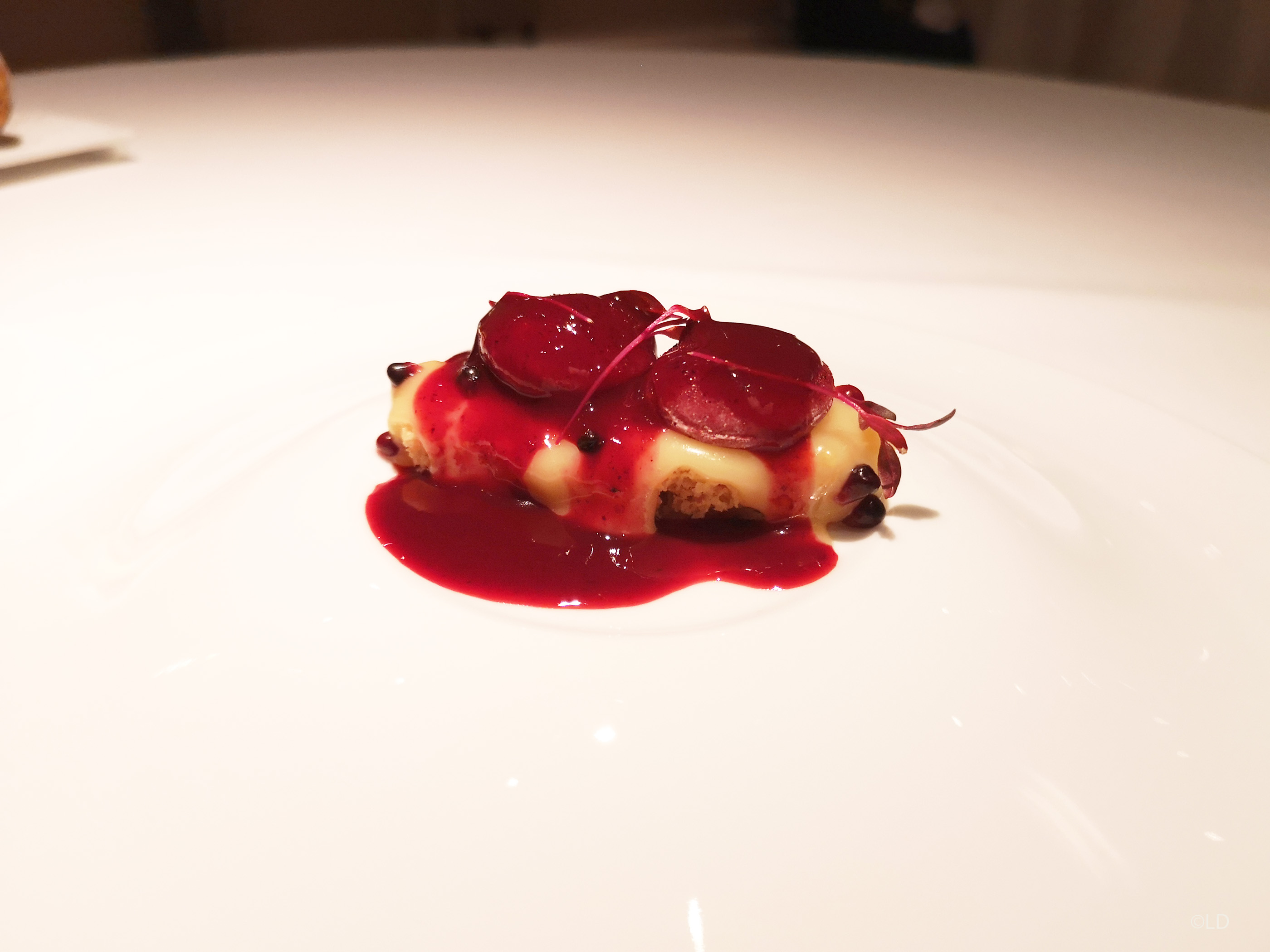 Carabinero, Poivron, tomate, Raifort, pistache, menthe, magnifique plat, légèrement épicé. Le canard, aubergine, bulbe de tulipe, grenade, olive noire, simplement divin ! Époisses, mûre, riz gluant, raifort, trois plats ‘Signature’ du talentueux chef Schutte