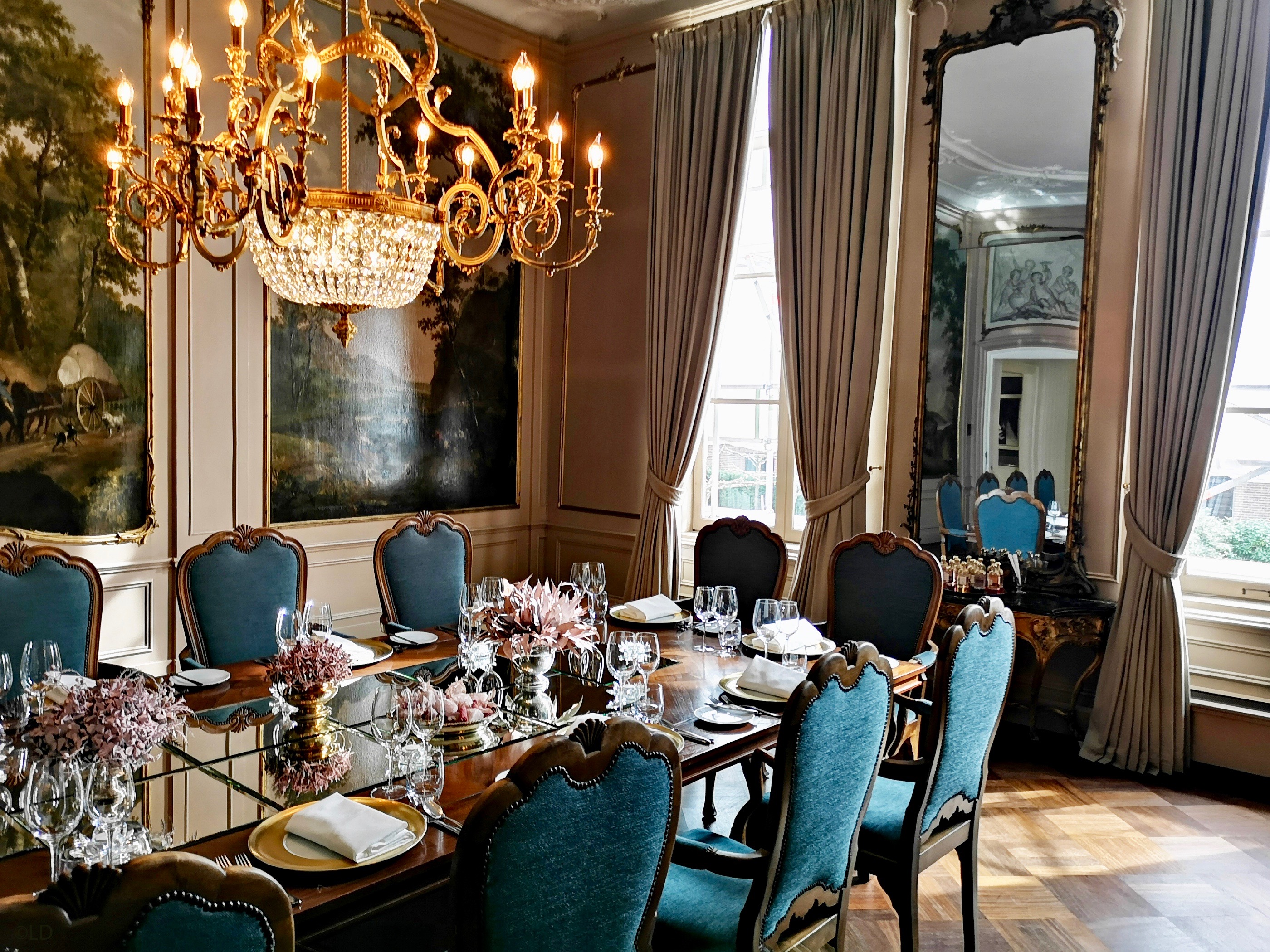Maison De Wildt, avec son salon décoré vers 1780, pour des repas privés, avec ses authentiques fresques et peintures, son mobilier de style et son parquet en bois venu de France; dans son cadre bucolique, la fontaine du vaste jardin de l’hôtel.