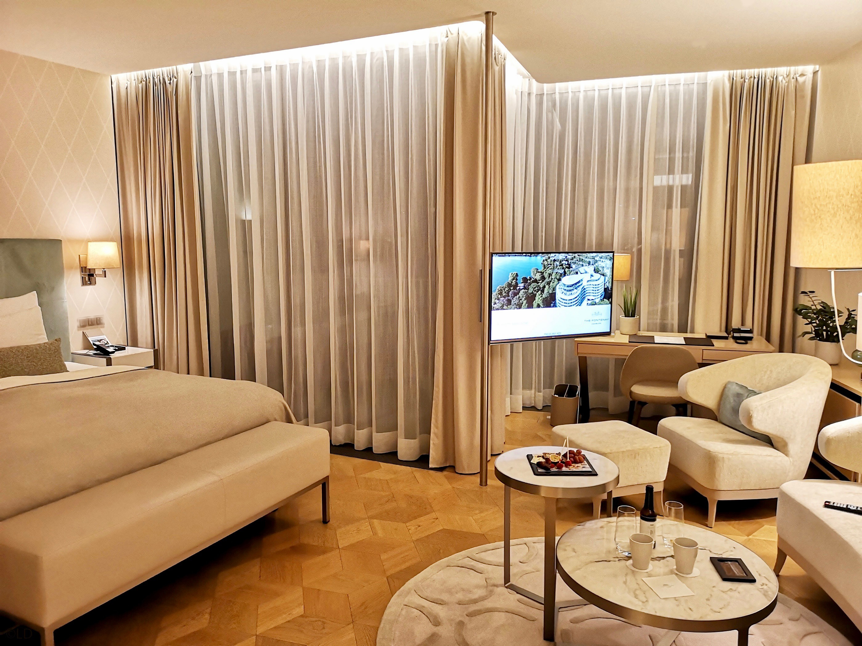 Les longues courbes des couloirs de l’hôtel; chambre Deluxe avec coin canapé – bureau et un balcon vue lac. Le bois de chêne des parquets provient des forêts de l’abbaye de Fontenay en France.