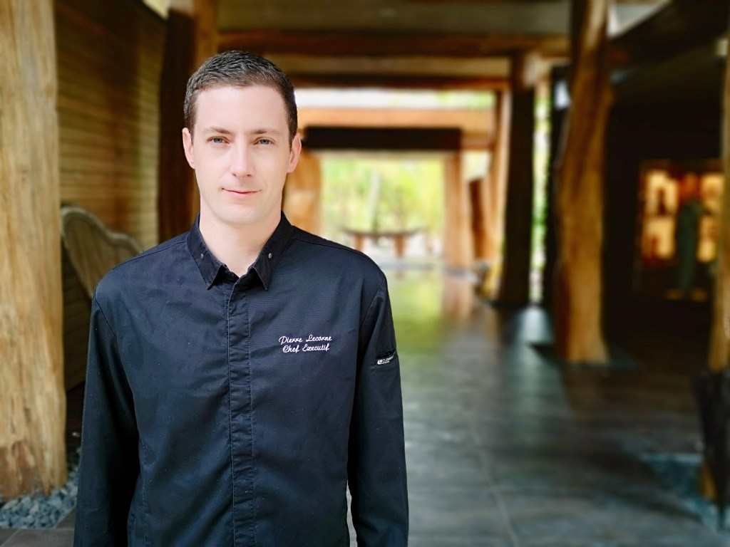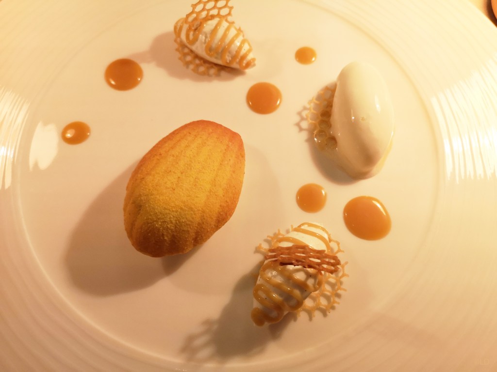 Korori, agrume et patate douce, sauce au champagne et hibiscus servi avec un vin Oyster bay Nouvelles Zélande 2021; Miel, fausse madeleine ! crémeux au miel de Tetiaroa, sorbet fromage blanc servi avec un Tokaji 2017 Hongrie; Chef des cuisines Mr Pierre Lecorne (photo)