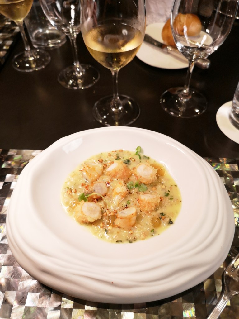 Crevettes panées et poêlées, risotto de Sarrasin à la vanille, ananas et basilic servi avec un excellent blanc Chapoutier 2018 Les Granilites Saint-Joseph; chef exécutif Nicolas Nguyen (photo)