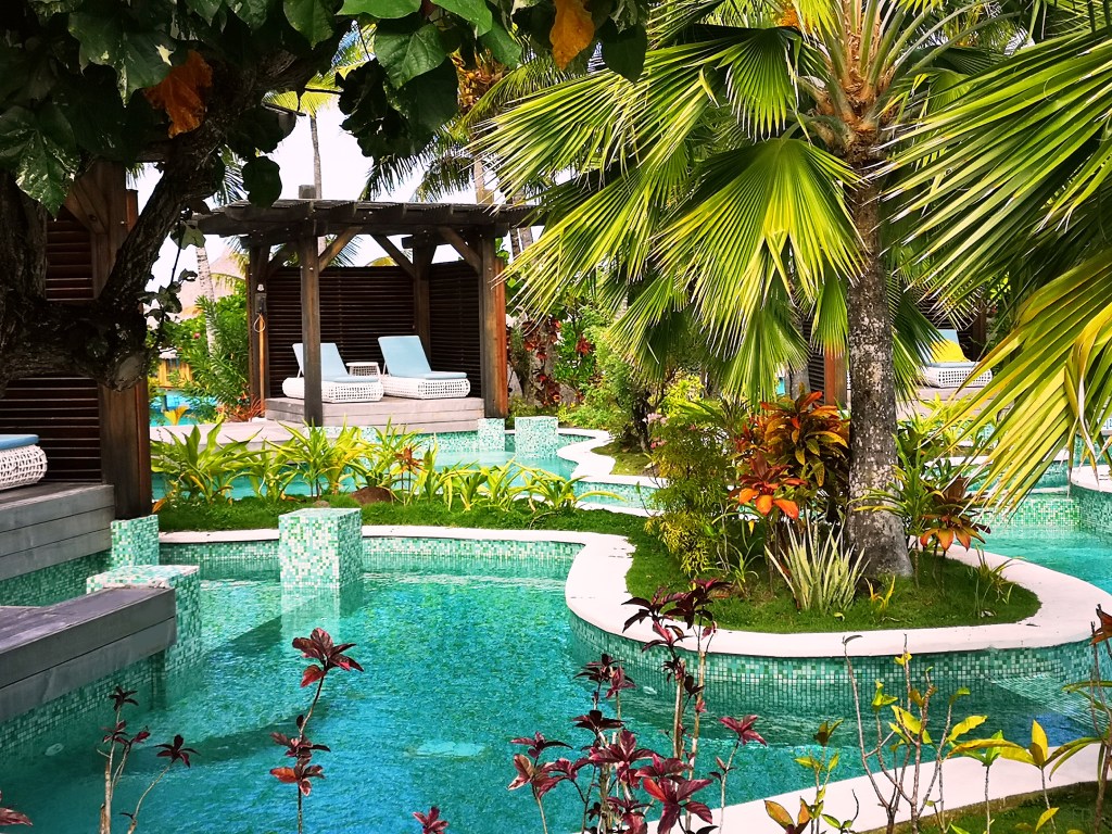 la longue plage de sable blanc du resort; la piscine fleurie, avec son beau carrelage, pour adulte ‘only’