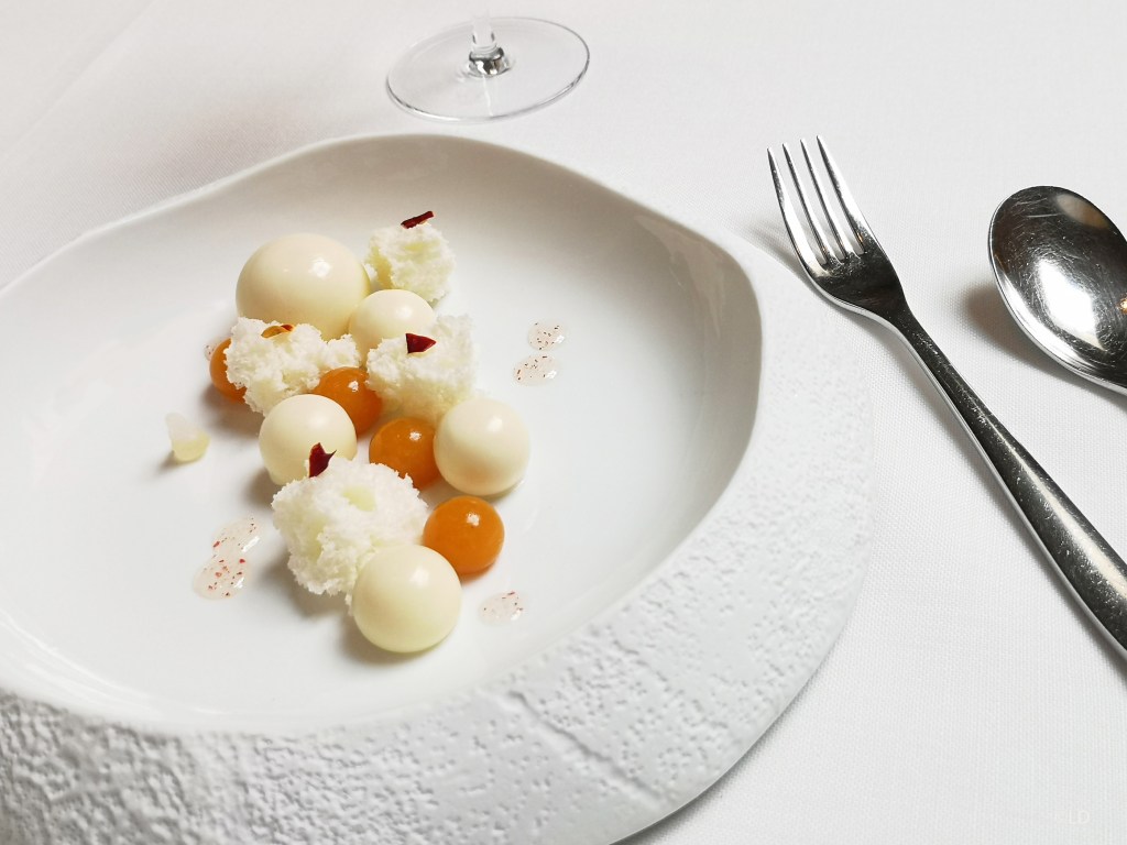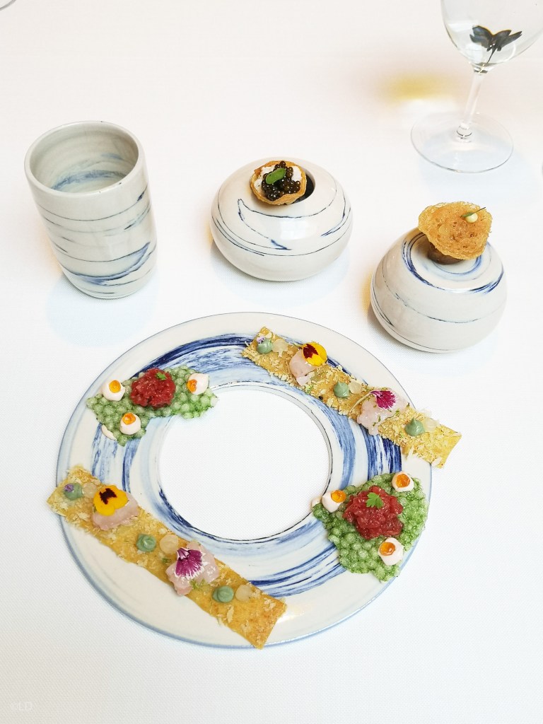 Le restaurant Lasarte, inauguré en janvier 2006, détient depuis 2017 trois étoiles au guide Michelin. Lasarte est l’ambassadeur de la cuisine de Martín Berasategui à Barcelone, il surprend par sa décoration contemporaine, ses espaces vastes et lumineux. Le projet de rénovation est l’œuvre des architectes Oscar Tusquets, Carles Basso et Tote Moreno et de la décoratrice Mercè Borrell. Le soin apporté à l’éclairage, les panneaux muraux où le chêne domine, et le choix du mobilier sont au cœur du projet: l’ensemble confère au restaurant un caractère tout en sobriété. Le restaurant dispose d’une salle semi-privée dans la salle principale et d’une salle à manger privée, la Table du Chef, pouvant accueillir 8 personnes, située sur une mezzanine au-dessus des cuisines, avec paroi vitrée pour suivre de près l’élaboration des plats. (photo) Messieurs Joan Carles Ibanez et Antonio Coelho, orchestrent et dirigent le ballet de leurs équipes en salle avec précision et talent, leurs rôles, accompagner l’expérience culinaire ! (photo) amuse-bouche