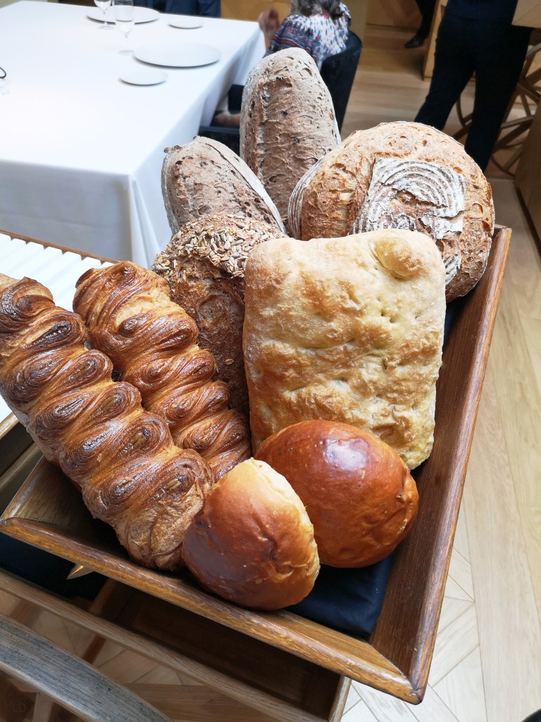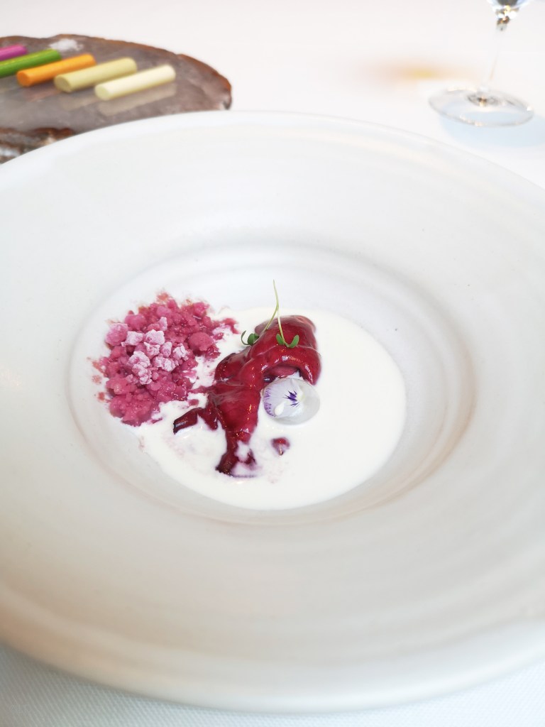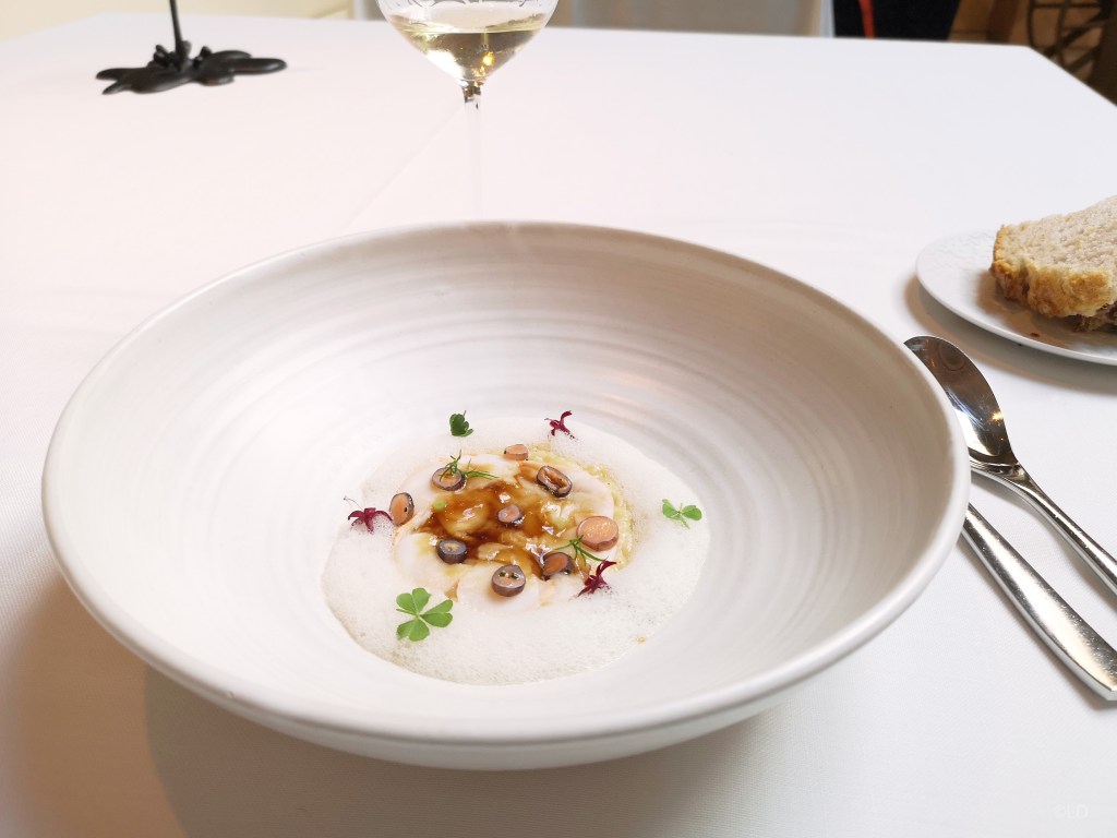 Huître Saint Louis de Normandie marinée à l’hibiscus, ajoblanco et au shiso violet, servi avec un vin blanc Xarel.lo de Terrer GR5 Senders Penedès Costers de l’Anoia 2020; 6 types de pains + 5 types de beurres ‘fait Maison’ saluons le travail des équipes !! Tartare de calamar avec du jaune d’oeuf liquide, consommé d’oignons et kaffir servi avec un Donnhoff Riesling Kabinett 2019 Allemagne