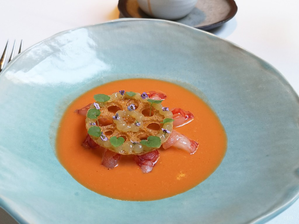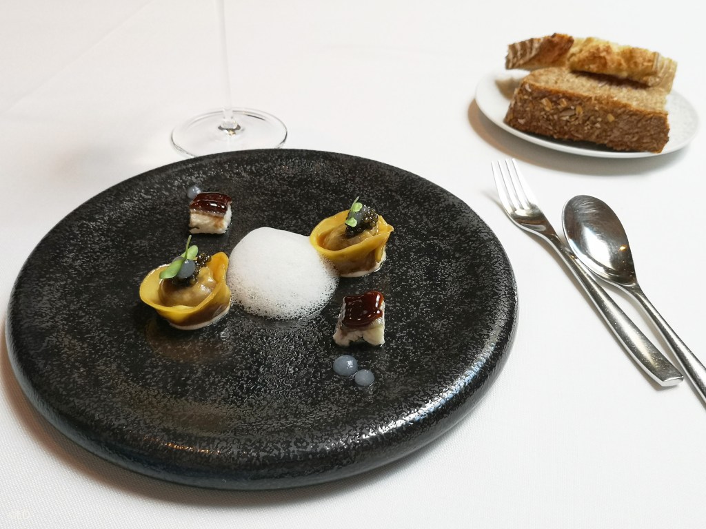 Soupe de carabinero, tomate, céleri et pomme verte, servi avec un vin Donnhoff Riesling Kabinett 2019 Allemagne, délicieux ! Ravioli de wagyu et anguille glacée, crème iodée, raifort et caviar servi avec un vin blanc Pai Horacio 2019 Grande reserva Douro Doc Portugal, magnifique association des produits, mariage parfait des saveurs et textures, deux grands plats !