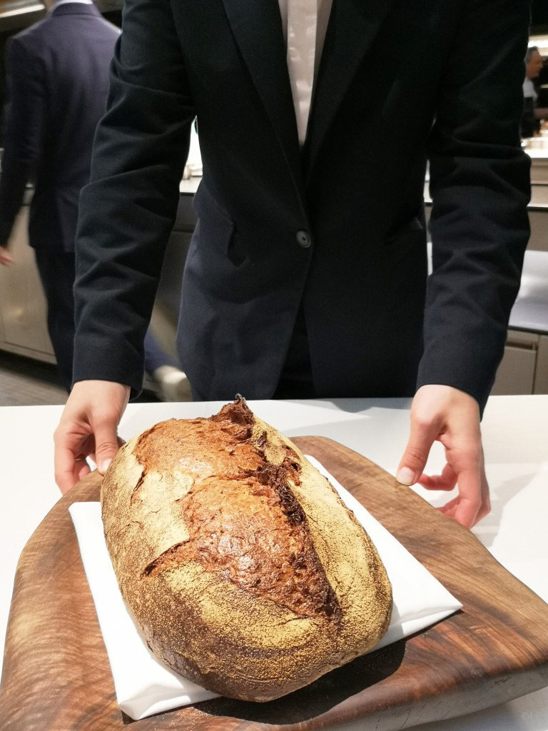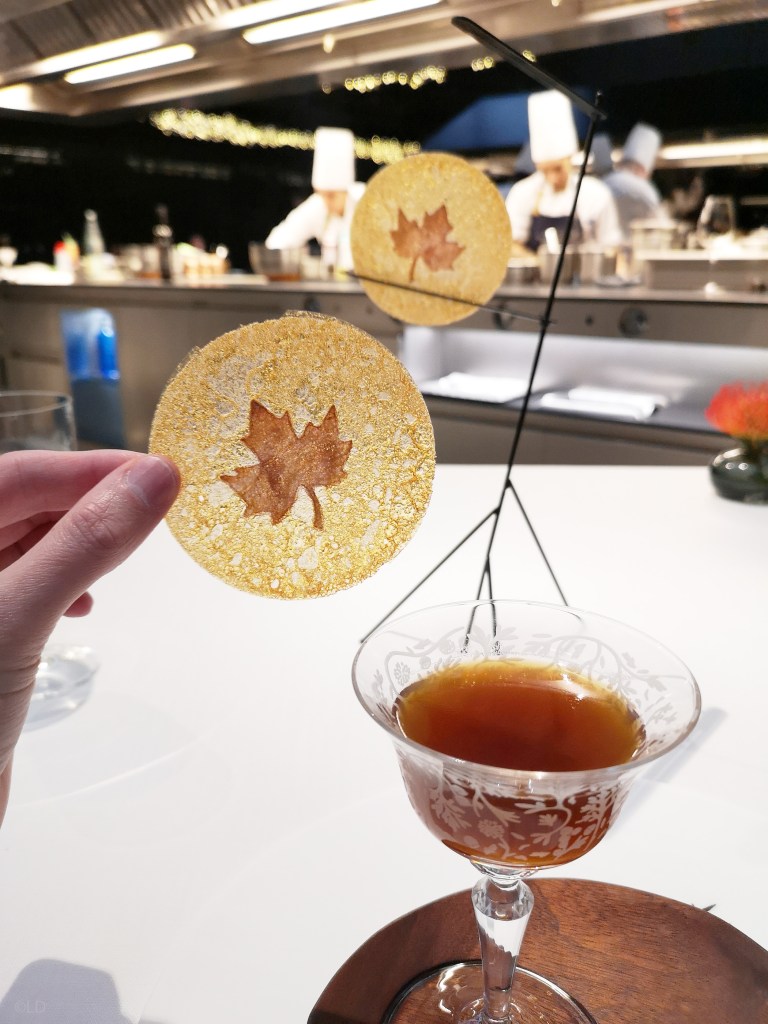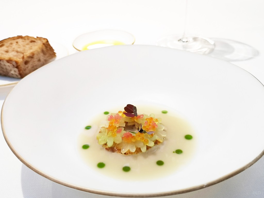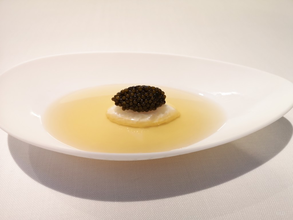 Le consommé d’hiver, réchauffe le convive, servi avec les fines feuilles-chips de romarin et cardamome (la saison); Calamar vieilli, bouillon de volaille et caviar du Tibet (mer et montagne) servi avec un vin blanc Pyritis 2020 Santorini mega cuvée, agréable mâche du calamar vieilli, et contre-balance avec la douceur du caviar et du bouillon; présentation du Pain, fait Maison, et de l’huile d’olives Borges Blanques