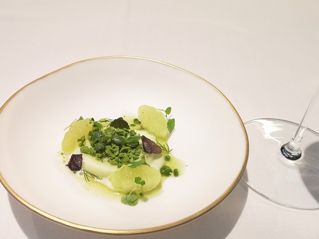 Anguille braisée, rutabaga, agrumes et basilic (Valencia, la Albufera) servi avec un blanc Palo Blanco 2020 ‘Envinate’ de Ténérife; magnifique plat et somptueux dressage