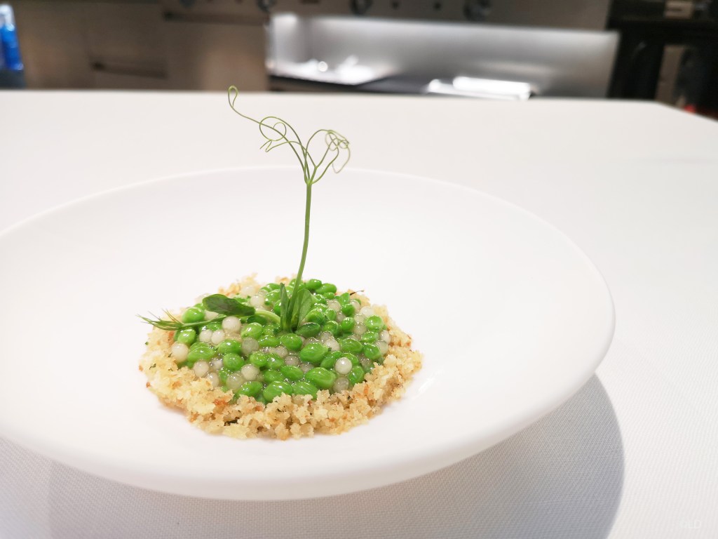 Petit pois du Maresme, jambon et ‘Migas del pastor’ (Fisan 1920) servi avec un blanc Orphée les Poëte 2018 France; sûrement les meilleurs pois au monde, avec un extraordinaire craquant, c’est tout simplement Exceptionnel, Divin, Époustouflant !