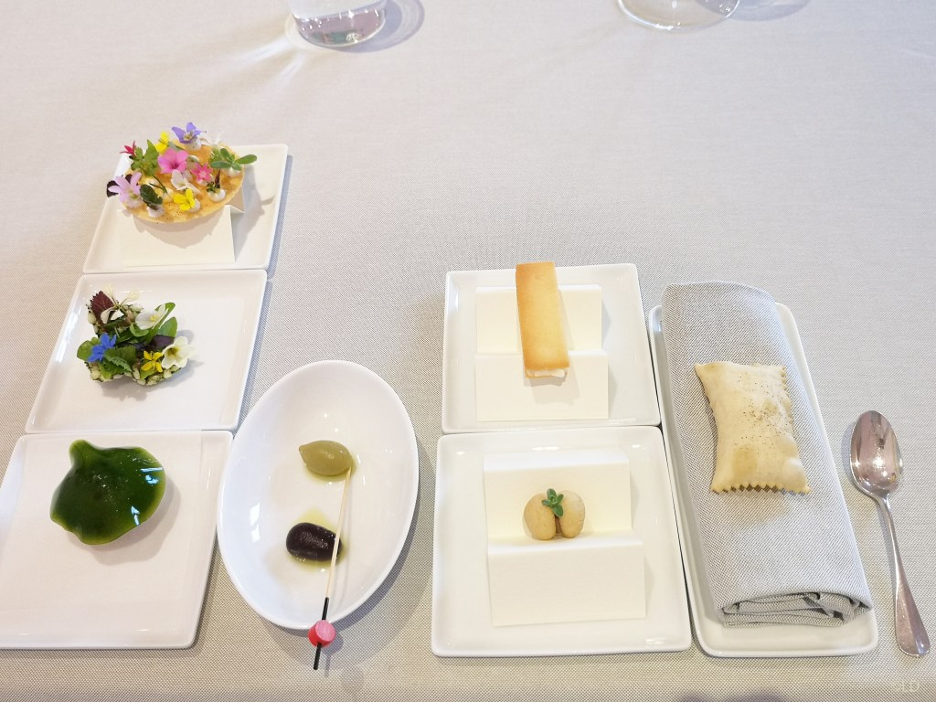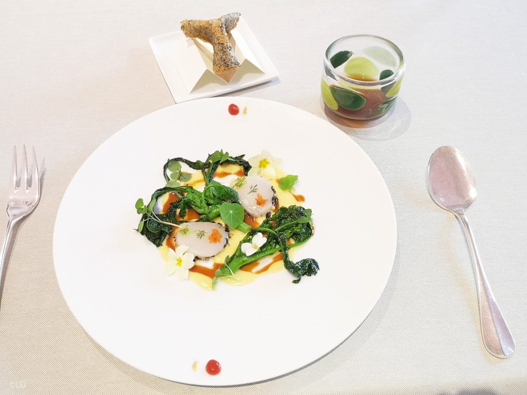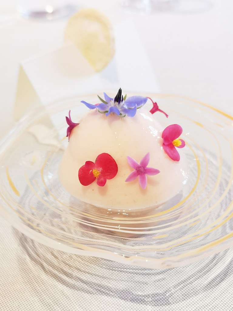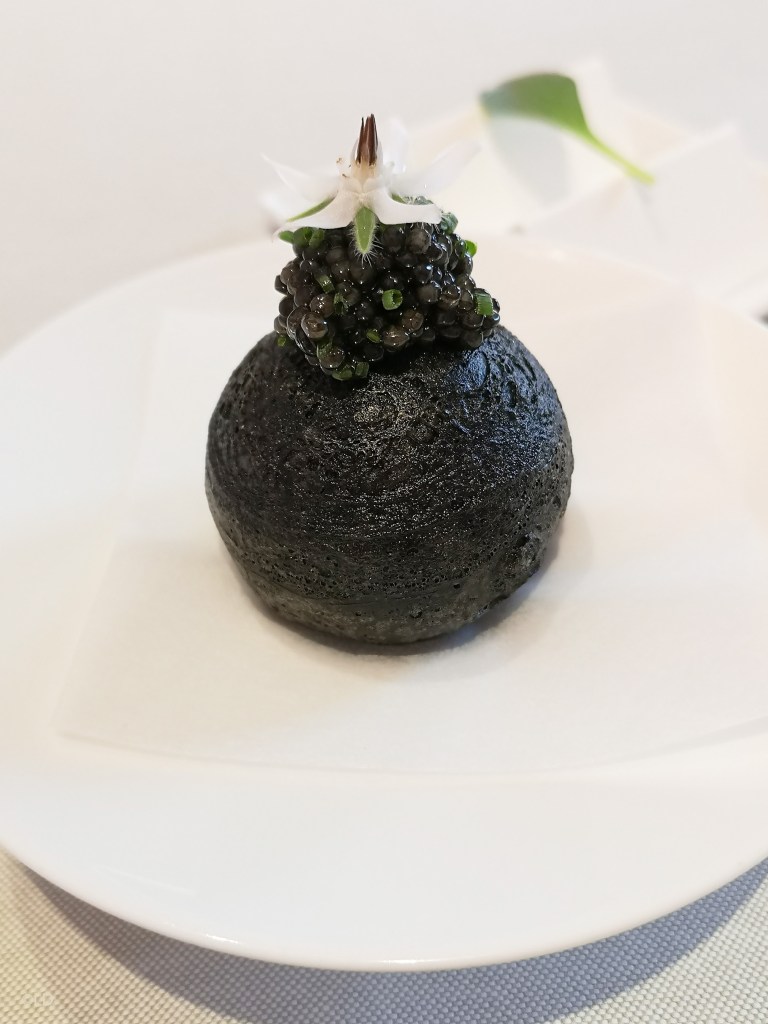 Mise en bouche, dressage soigné, élégant, jeux de textures, de saveurs, de parfums, du grand Art culinaire ! servi avec un vin pétillant Marcalberto Nature 2018.