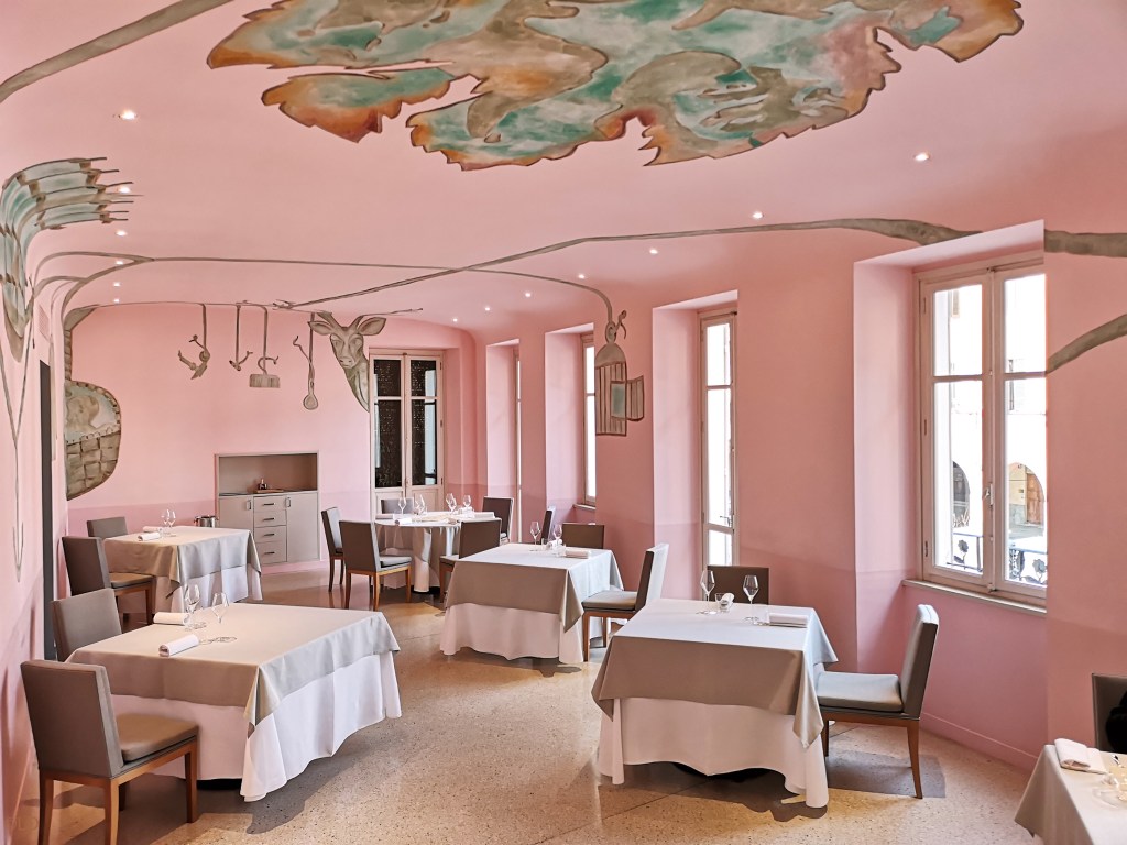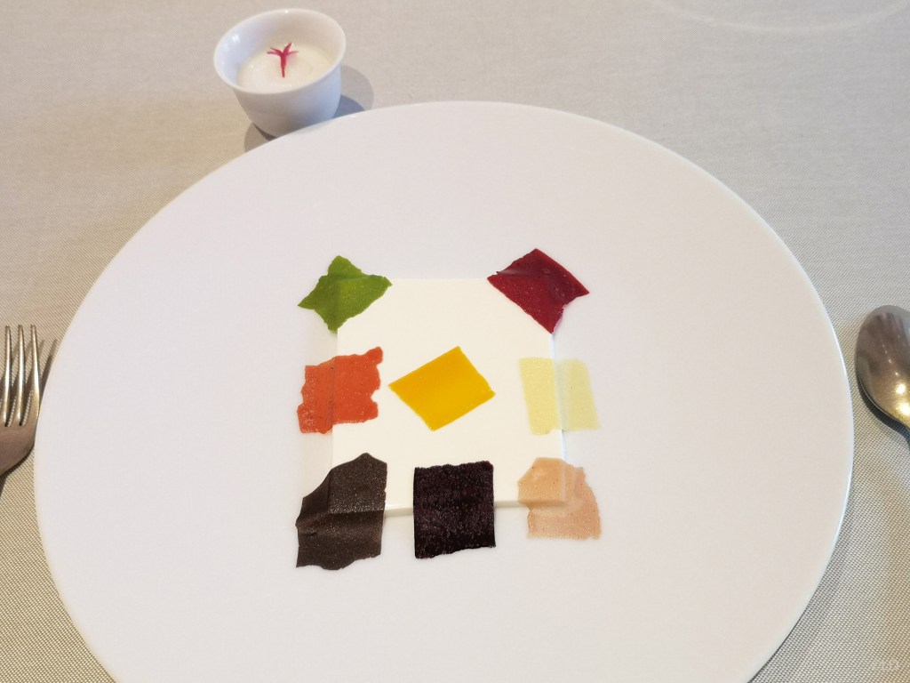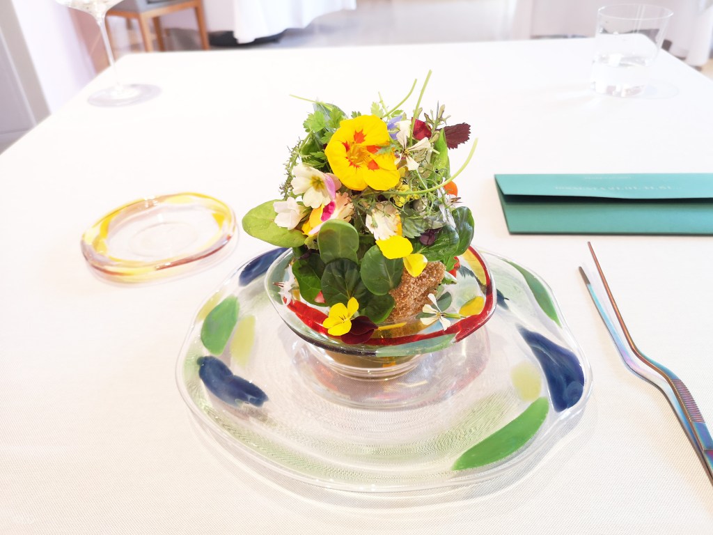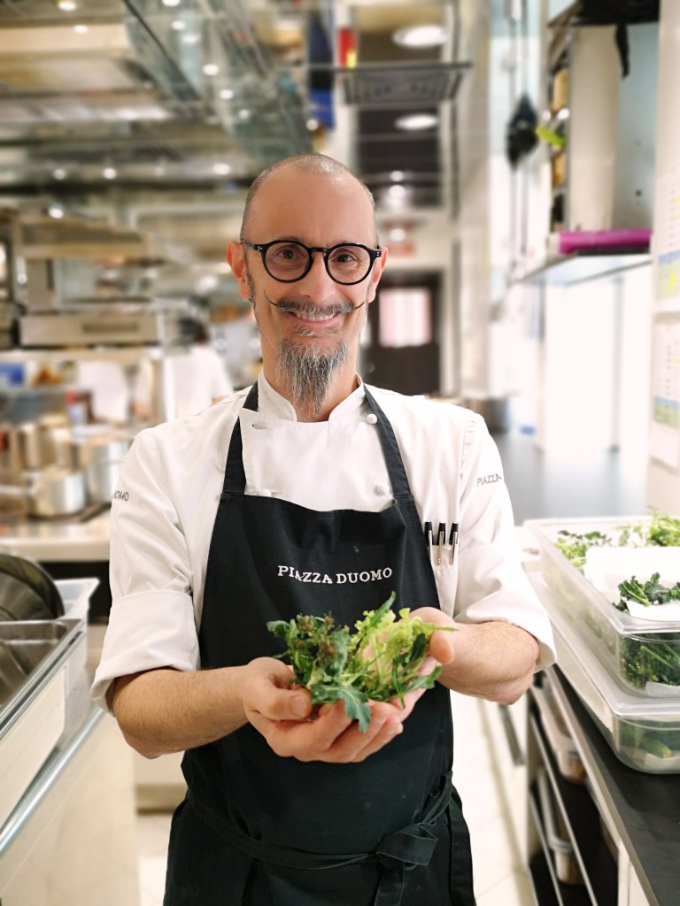 ‘Le commencement’ Antipasto Piémontais, extraordinaire valse de petites assiettes et bols fleuris, végétales, herbacés (crème caramel, miso, épinards,…) quelle spectaculaire présentation, le potager vous est servi à table ! unique au monde, Bravo, Exceptionnel ! servi avec un vin blanc Ceretto Langhe Arneis 2021 Parfait ! C’est un décollage pour la planète ‘Nature’ envol dans un monde végétal, une expérience éblouissante qui fait de Piazza Duomo l’une des plus belle et excitante Table au Monde ! Crippa est complètement connecté avec son temps, en phase avec son époque ! plus qu’une cuisine ‘santé’ ! c’est un voyage sensoriel, à travers le temps et l’espace, une double volonté du chef: d’une part, sublimer le lien avec le territoire et son histoire; d’autre part, explorer de nouvelles frontières du goût, dans une synthèse ‘créative’ en constante évolution qui, tout en partant toujours de la saisonnalité et du soin du potager, regorge de suggestions internationales.