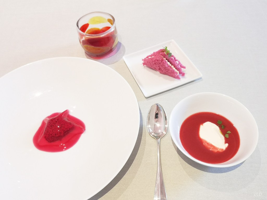 2007, les débuts, Salades 21, 31, 41, 51,… ici sont regroupées 85 fleurs, feuilles, herbes,… l’eau des plantes est récupérée sous la soupière et accompagne la dégustation !Apuila, St Jacques et oursins de mer, avec une tuile et un consommé. À… l’Est, La betterave en quatre déclinaisons ! (soupe bosch, jus de bosch,…) ces 5 premiers plats ont été accompagné du vin blanc Ceretto Langhe Arneis 2021