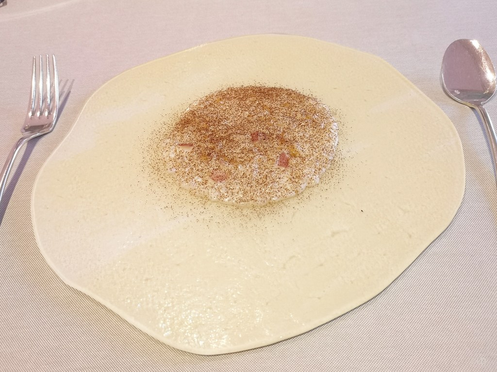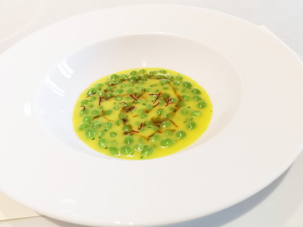 Milan, petits pois et safran; Hommage à Anselm Kiefer, calamars et chardons, polenta, blanc d’oeuf, crème de chardons et anchois, servi avec un magnifique vin rouge Barolo Prapo 2015 Ceretto. Arrivée de deux types de pain, et des grissini au maïs fait ‘Maison’ (Le gressin est un petit pain allongé et sec originaire de la région du Piémont, généralement pas plus épais qu’un stylo pour 25 cm de long environ. Son origine remonte au XIVe siècle.)
