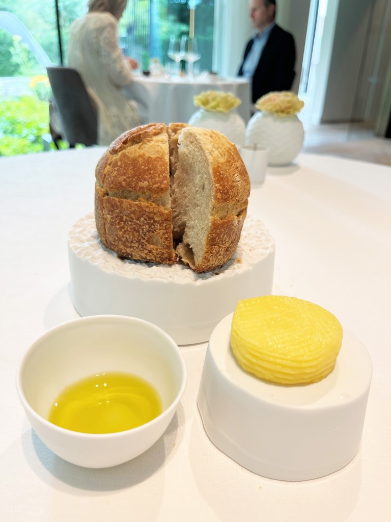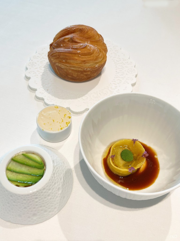Pain (brioche) soufflé, Harissa, anchois fromage blanc, cashew, sumac, délicieuse Tortellini d’agneau, beurre yuzu & ponzu; Huître Irish Mor, Wagyu; servi avec un vin muscadet Terre de Pierre 2021 France; Pain de la boulangerie, Neus huile d’olive Arbequina extra vierge Calalogne Espagne, beurre de Normandie