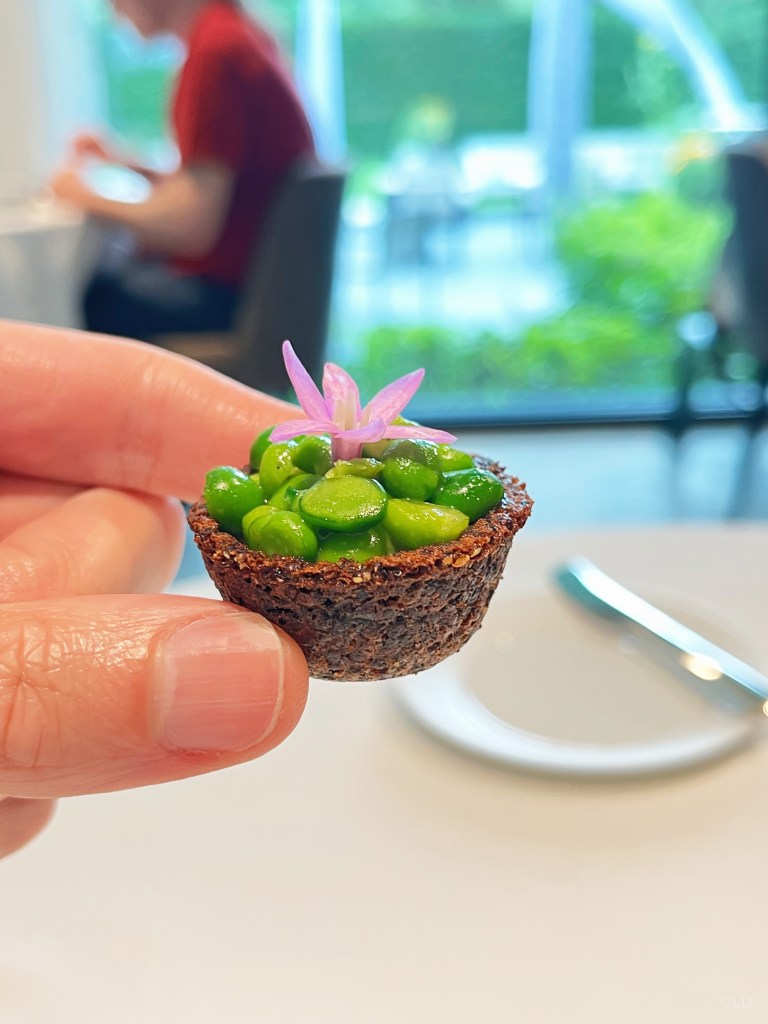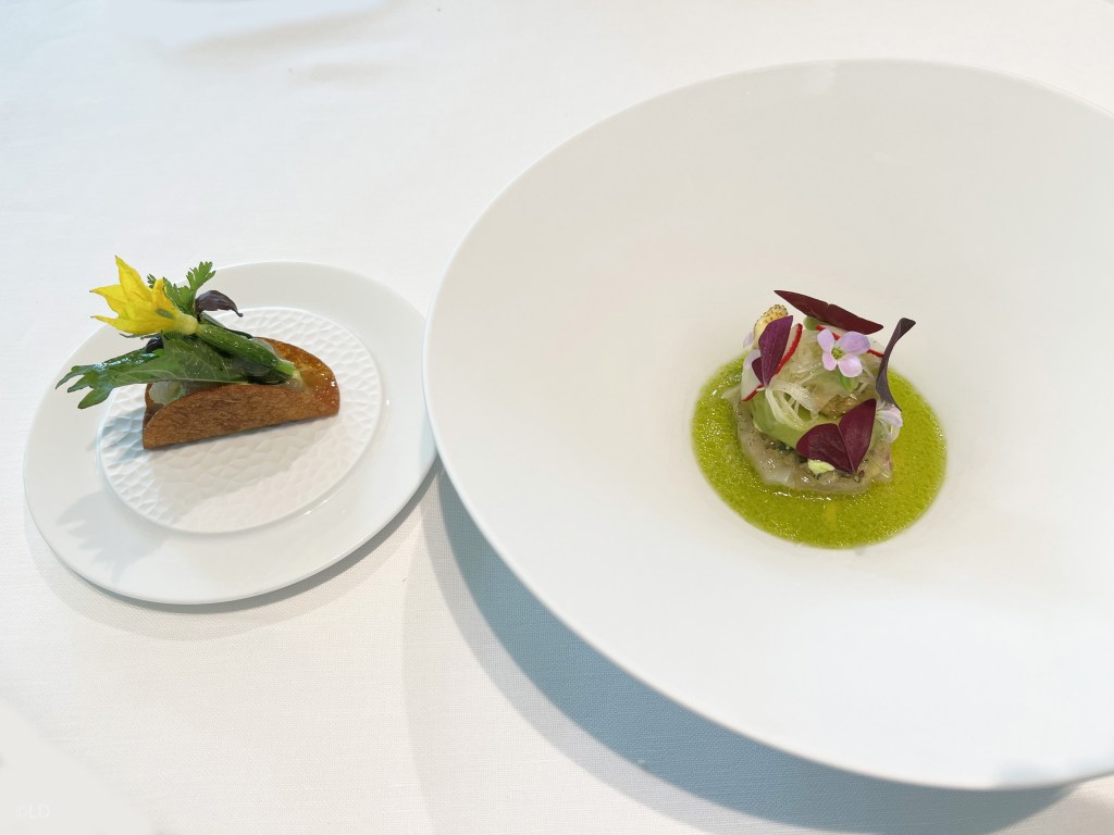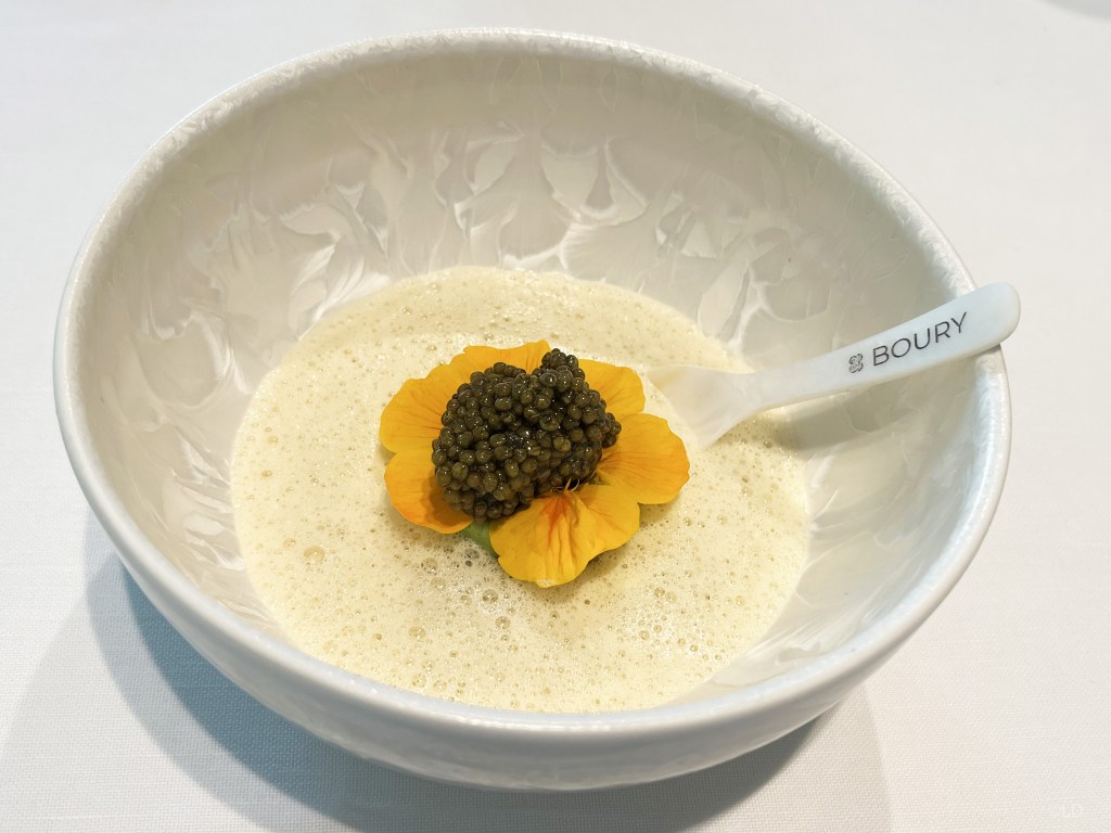 Turbot de la mer du Nord, version dry age pour une bonne structure en bouche, un poisson très bien nacré et élégant, moules de Bouchot de la baie du Mont Saint-Michel en émulsion, lavandes de mer, Bimi petits brocolis en crème, huile citrus africain en fleur d’agrume pour l’acidité et la touche florale, tagète, servi avec un The Agnes 2021 Chardonnay Crystallum de l’ouest du Cap Afrique du sud. Première préparation de l’asperge Blanche, salade de tourteaux, asperge marinée, un crémeux à base de maïs et bonite, Daidai, servi avec un Alvarinho Monçao e Melgaço 2022 Quinta de Santiago; deuxième préparation de l’asperge Blanche, grillées, émulsion de pommes de terre, vieux fromage ‘brocol de ruicelin’ et jaune d’oeuf de la ferme, sarrasin, servi avec un blanc Brama 2022 Biancu gentile P. 164 Clos Venturi.