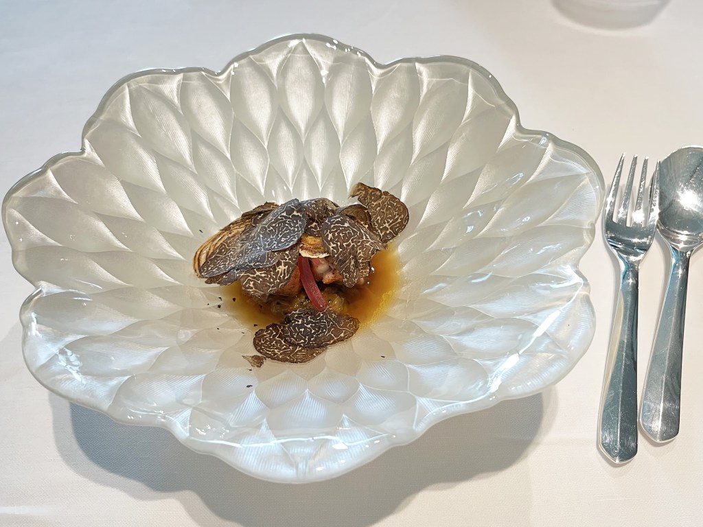 Plat ‘Signature’ pour cet été ! préparation de langoustine, Kaviari Paris ‘Osciètre Prestige’ gelée de rhubarbe, beurre blanc dashi, soja fumé, mélisse servi avec un Franz Keller 2020 Oberbergen Bassgeige Weissburgunder. Ris de veau, oignon des Cévennes, truffe noire d’Australie, servi avec un Altesino Rosso di Montalcino 2020 Toscane Italie