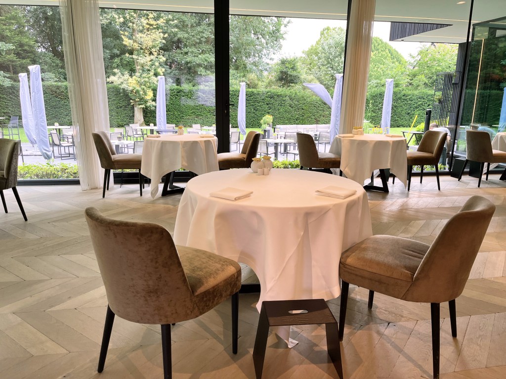 Suites No 2 situé au 2ème étage, accès avec l’ascenseur directement dans l’appartement, grand salon, charpente peinte, diffuseur géant, salle de bain lumineuse, terrasse balcon, et cette magnifique touche de décoration Belge: le design de l’espace est »Waouh » ! Salle du restaurant gastronomique avec ses grandes baies vitrées et sa vue sur la terrasse jardin.