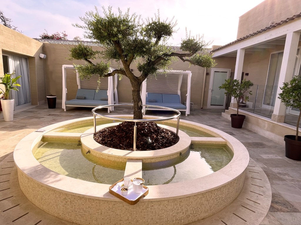 The Fitness Center: 2 modern glass rooms fully equipped with air condition; Pure Seven Spa is a haven of peace dedicated to physical well-being. Around the garden courtyard are a set of treatment and cosmetic rooms, complemented by a herbal tea room, hammam, sauna, emotional experience shower, ice shower and indoor and outdoor areas for Kneipp treatments and relaxation. (olio di mandorle, cosmesi naturale di Erbe di Sardegna)