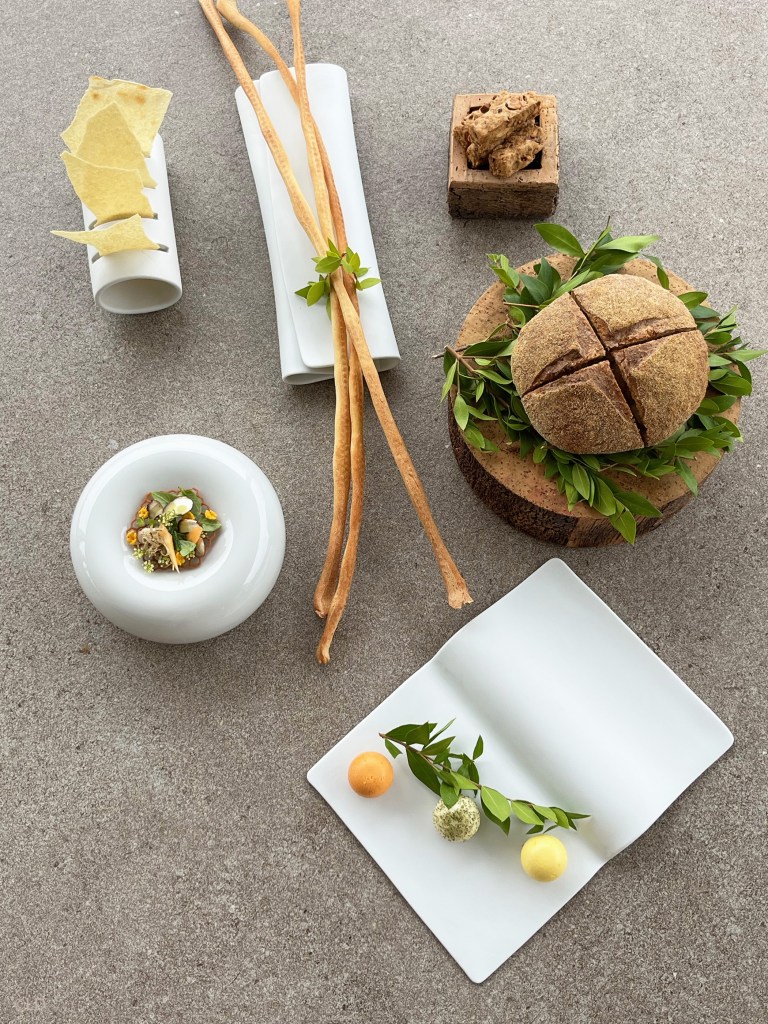 Red mullet, filindeu, aubergine pesto and almonds, lentisk mayonnaise, marine herbaceous powder; Egg in the sea, organic egg, seaweed bread, warm seafood salad, grilled mullet broth; Menu ‘Aria, acqua, sole e terra’ Profondita: Raw fregola, shellfish and crustaceans, seaweed, burnt citrus fruit.