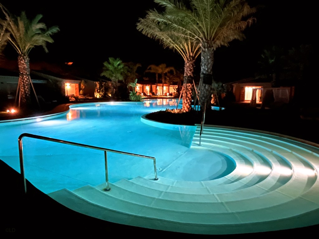 The resort’s two pools, each with their own distinct ambiance, the larger is closest to the restaurant and next to the glass-walled gym. The Laguna pool is reserved for guests staying in Laguna rooms and suites.
