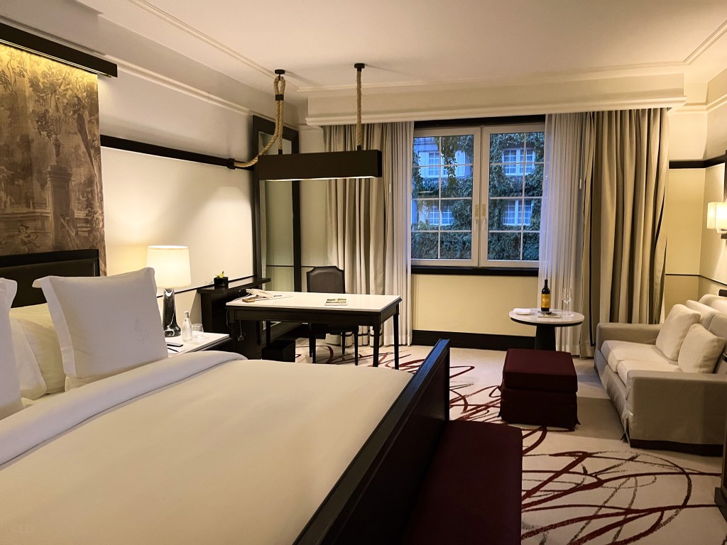 Room Deluxe 331, with a desk area, sofa, bathtub and shower, view of the courtyard garden