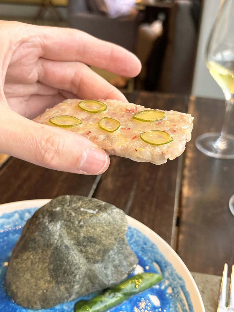 Lobster from Juan Fernandez Island coked on a seaweed bladder pairing with Duquesa D’A, Aristos, Grand chardonnay, Alto Cachapoal 2016; Native spring aromas salad »Van Gogh » pairing with Domus Aurea, Quebrada de Macul, Cabernet sauvignon, Maipo 2008 or Fig and Algaes
