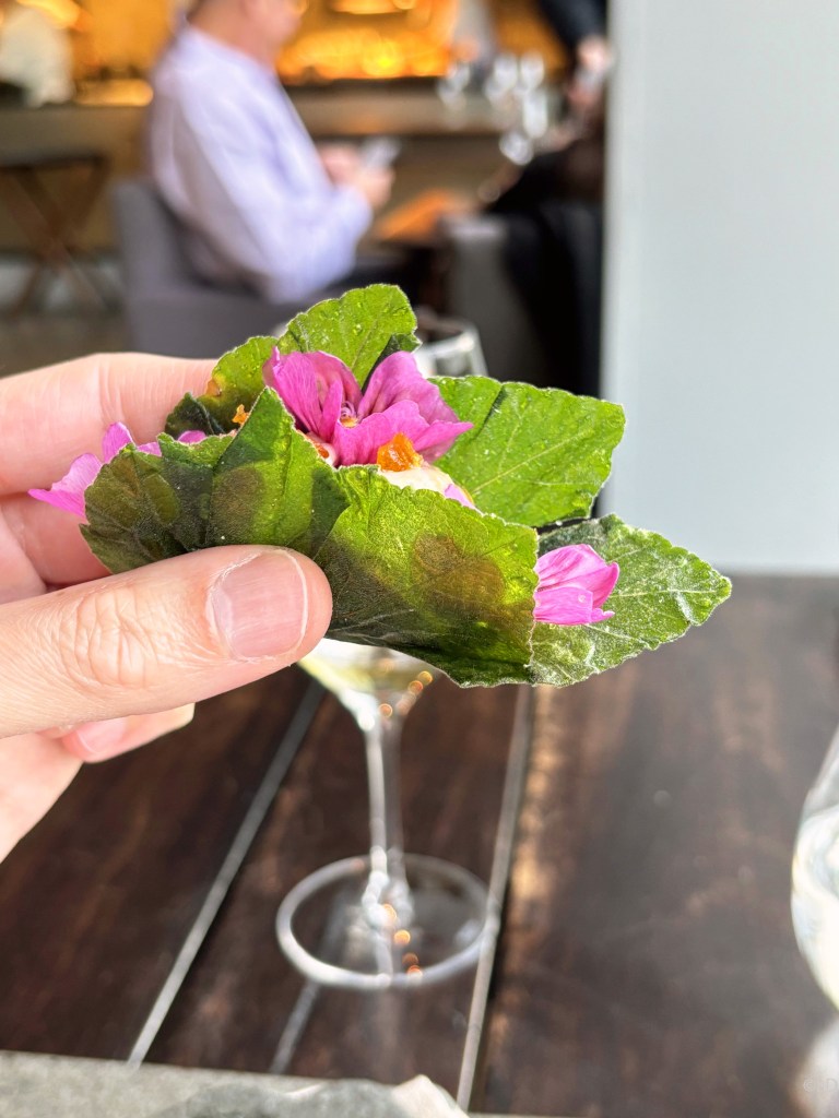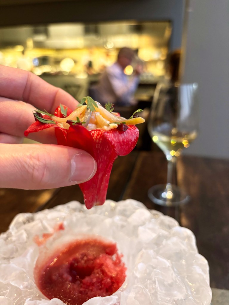 Spring poppies, picha picha, Chilean morell and nalca; Scallop crudo and sea weeds extract pairing with Arcillas, Laberinto, Riesling, Maule, 2020 or Carrot and orange blossoms