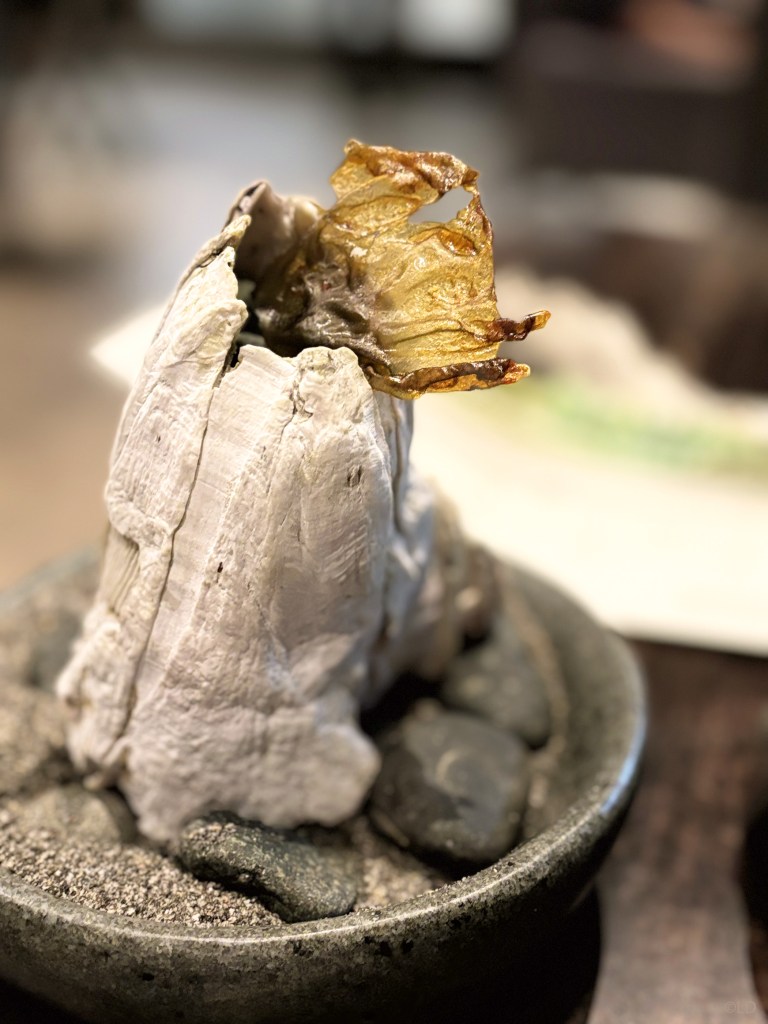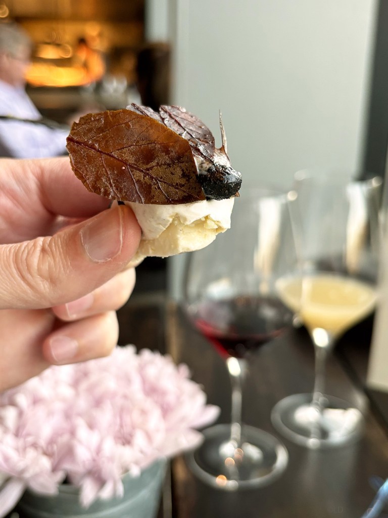 Representation of the bee, made from potatoes treated like a Camembert cheese fermented for several weeks, garnished inside with a Chilean truffle cream and a semi-cold cheese. Bee made of Chilean alfalfa and truffle pairing with Casa Marin, Pinot noir, Lo Abarca 2016 or Amazake champenoise de flor de sauco and wild yeasts