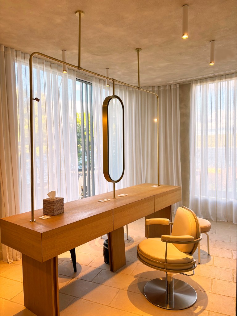 Interior designer Léonie Alma Mason created an intimate and theatrical atmosphere, fresh and modern. The enormous block that serves as an office comes from the quarries on the island opposite.