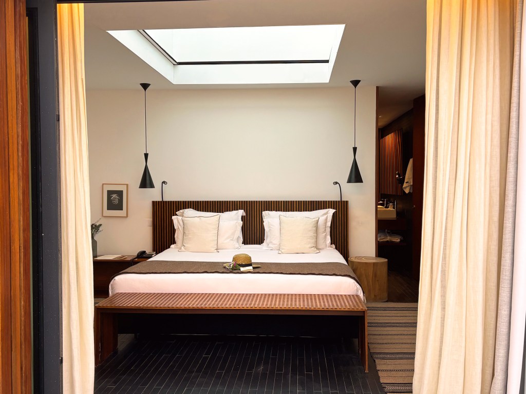 Morning sky with a full moon,… Sky View suites 9, provide a unique experience of sleeping “under the starry sky of Alentejo”, through the opening of the bedroom ceiling. With 75 sqm or 120 sqm, they are a romantic sanctuary .The decor makes use of wood and natural stone to provide a serene space. The Sky View suites, are decorated by Marcio Kogan.