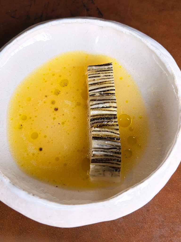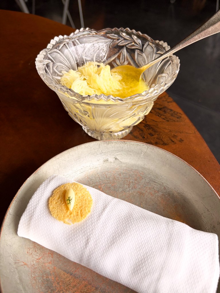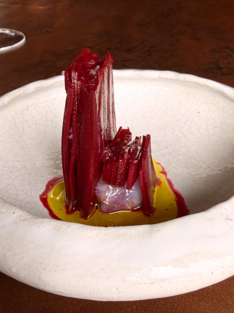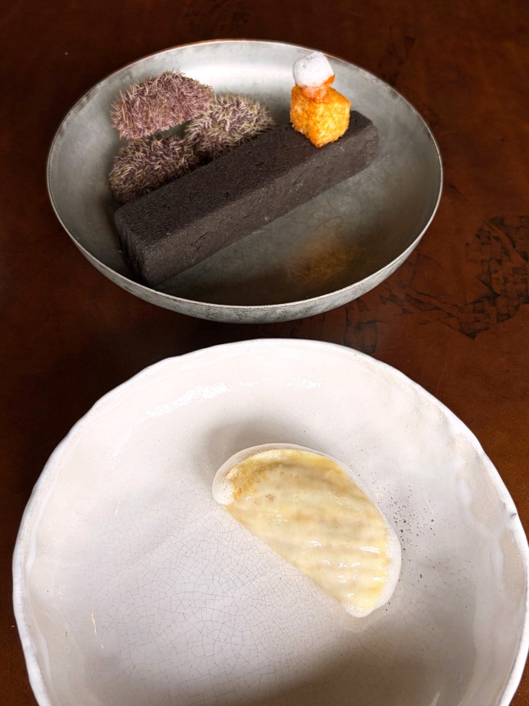 La carotte pourpre et langoustine; Le blinis de lait entier et tourteau de nos côtes, lait entier des fermes de région, langue d’oursin pêché en mer du nord, servi sur une brioche beurrée; Radis noir et bouillon de navets fermenté, sublime !